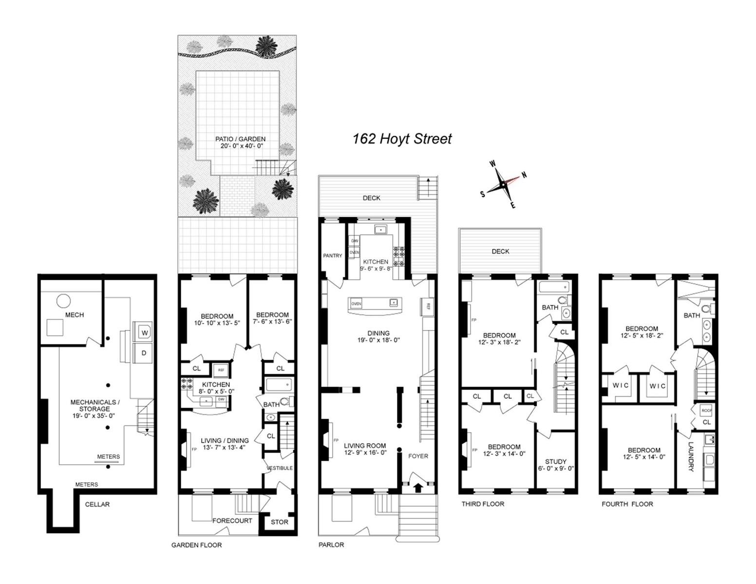 Up one flight of stairs you will find 2 large bedrooms, a full tiled bath with tub, and an office/nursery room. The front bedroom has a working fireplace. The rear bedroom features a very nice deck on top of the extension with great views of the neighborhood and Brooklyn skyline. The top floor offers two more large bedrooms, a full bath with shower, and a large laundry room.