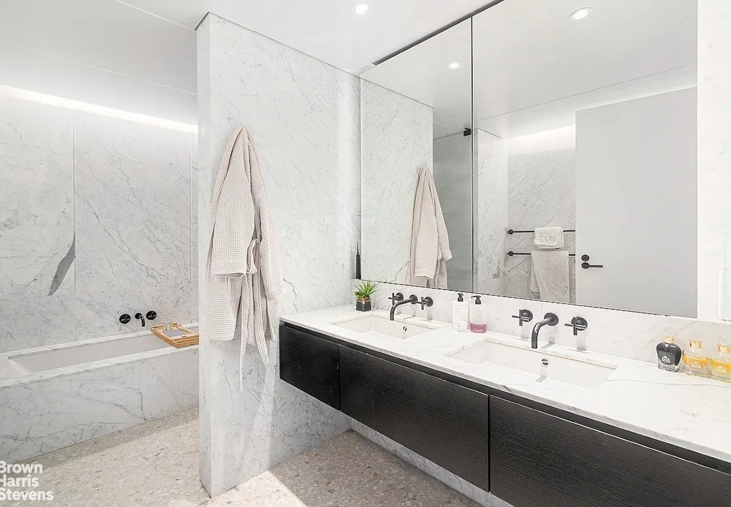 The master bedroom with direct Empire State Building and city views includes en-suite master bath features full height Statuarietto marble walls, double vanity with marble top, and enclosed wet room with rain shower. The secondary bath and powder room are also appointed with Statuarietto marble walls and vanity.
