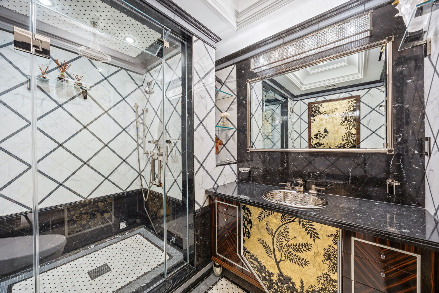 Each bathroom is a work of art in its own rightone is enveloped in alabaster, another features rare amethyst sourced from Tanzania, while the others showcase stunning onyx and lapis lazuli, creating a one-of-a-kind living experience. Adding to the grandeur, stunning Baccarat chandeliers illuminate the space, casting a warm, opulent glow that enhances the homes timeless elegance.