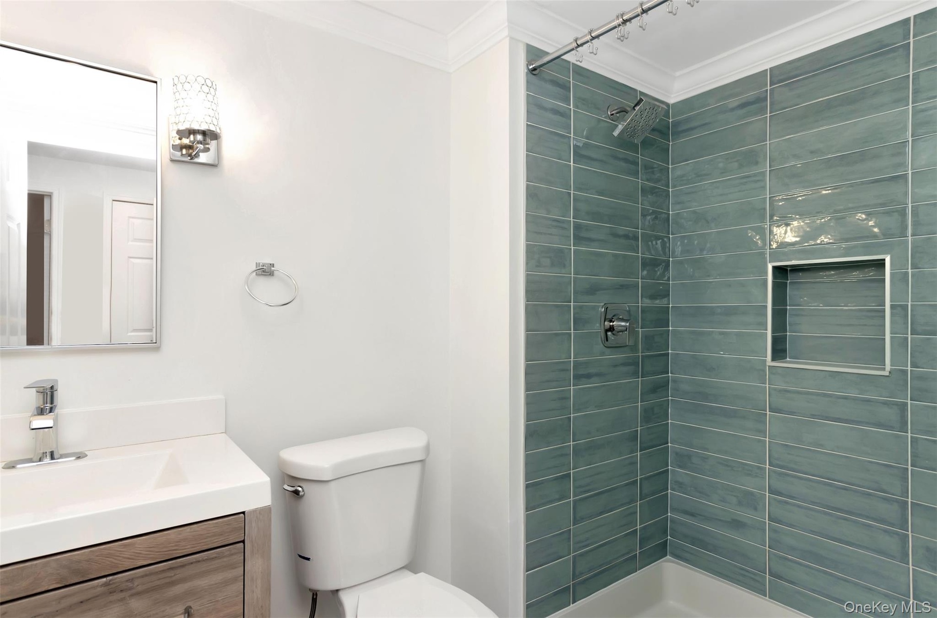 - Full bathroom featuring a tile shower, toilet, crown molding, and vanity