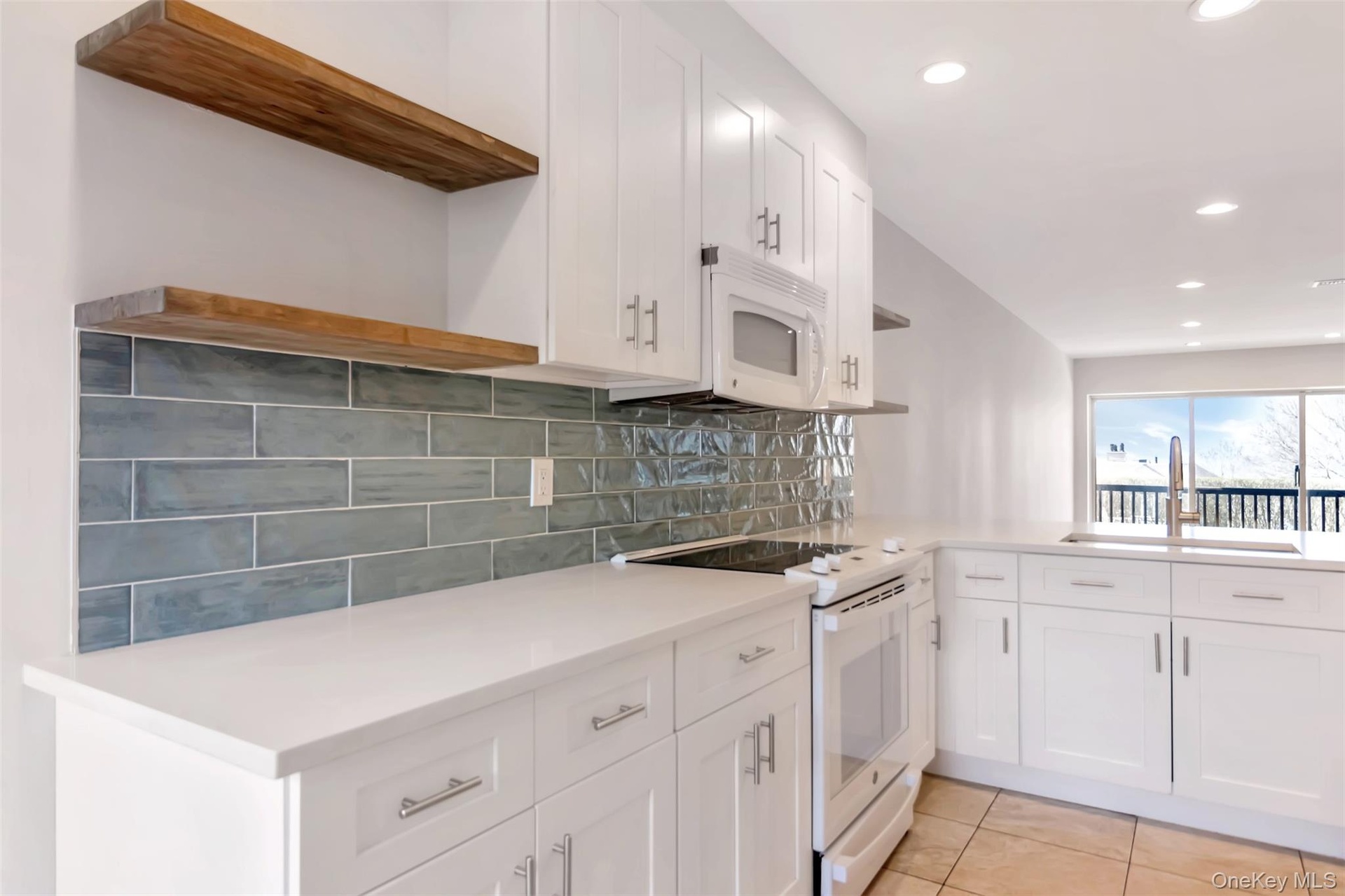 - Kitchen featuring open shelves, a sink, white microwave, backsplash, and white cabinetry
