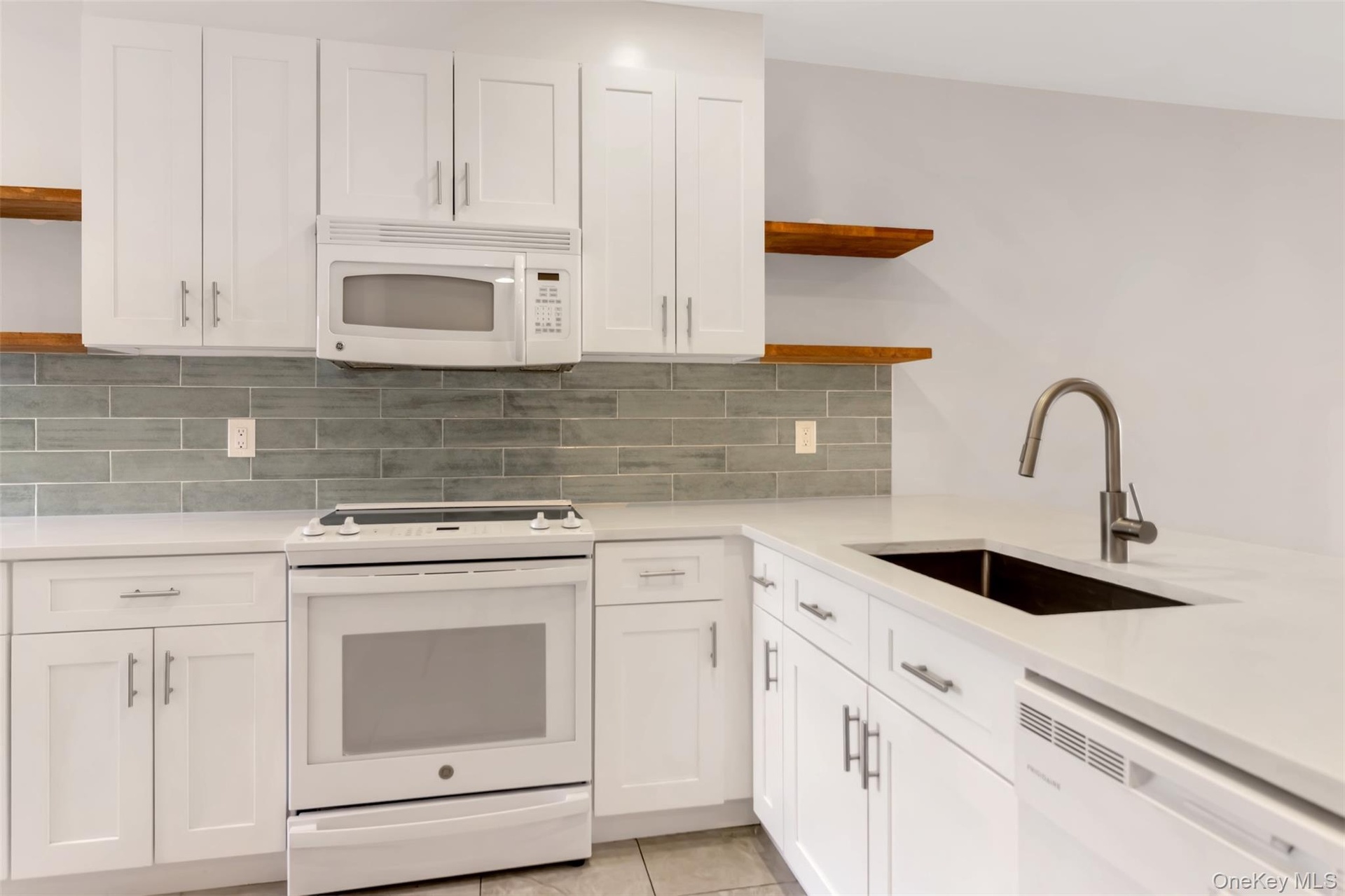 - Kitchen featuring open shelves, a sink, white appliances, backsplash, and white cabinetry
