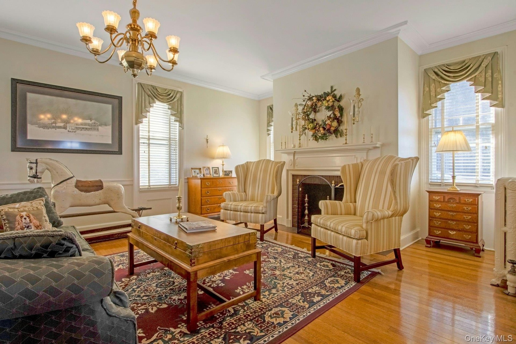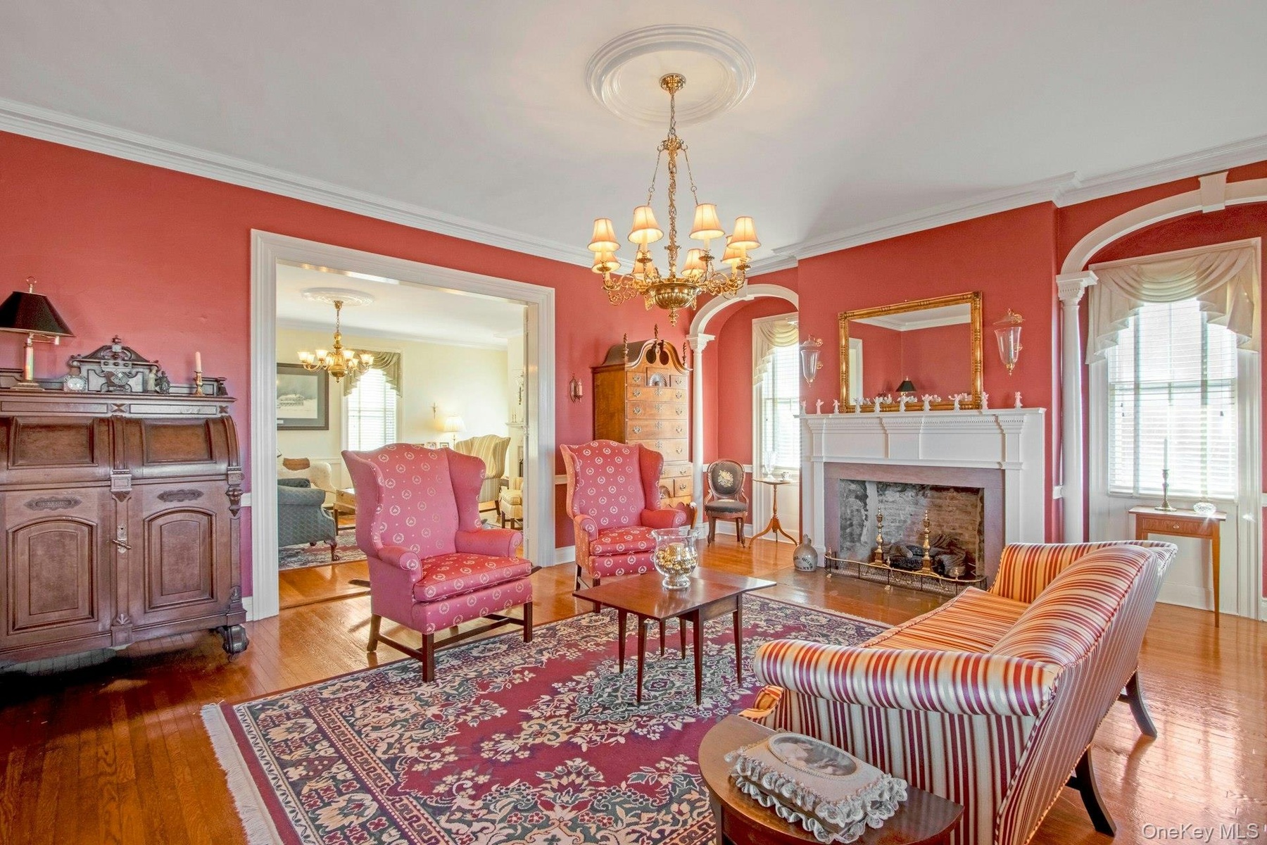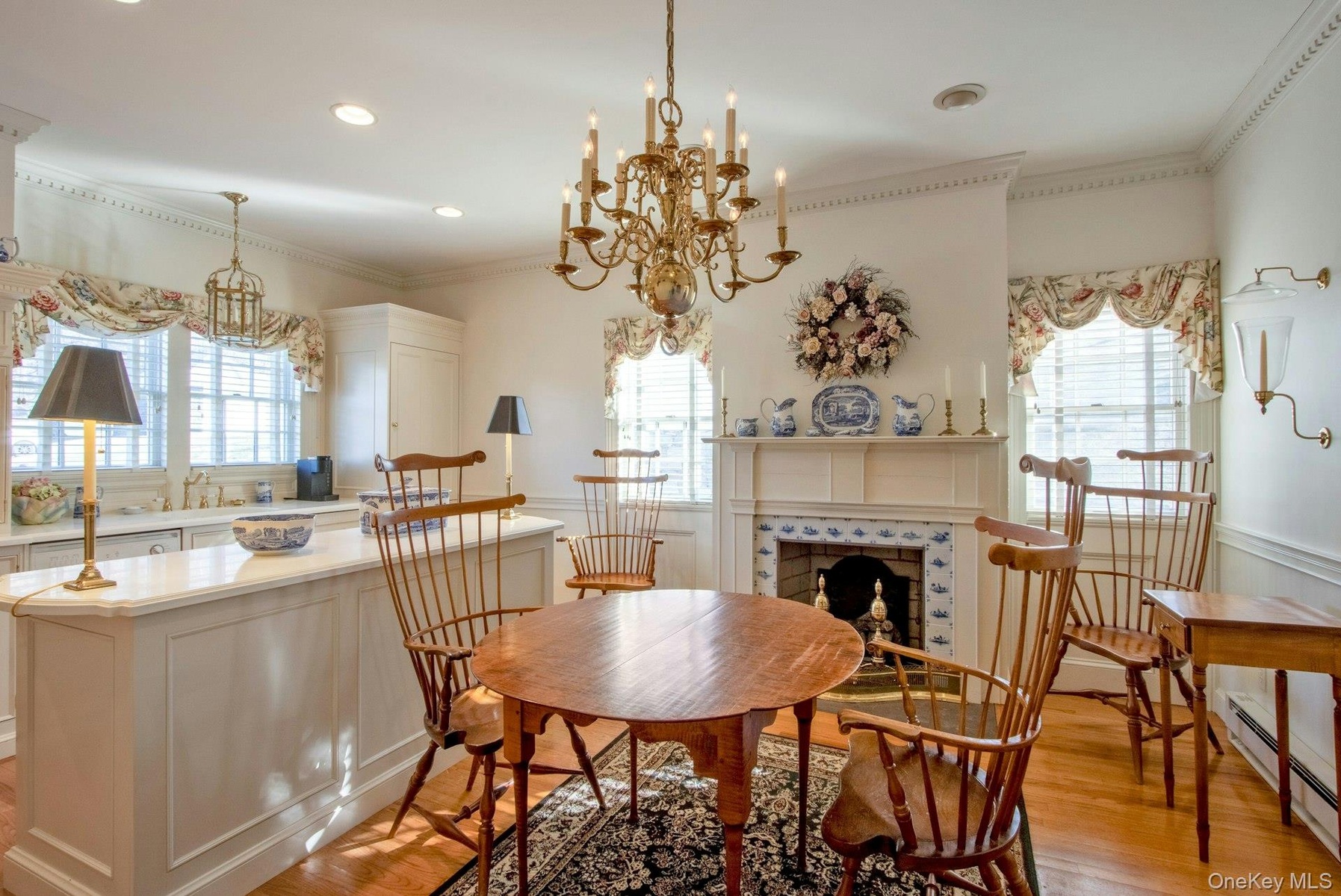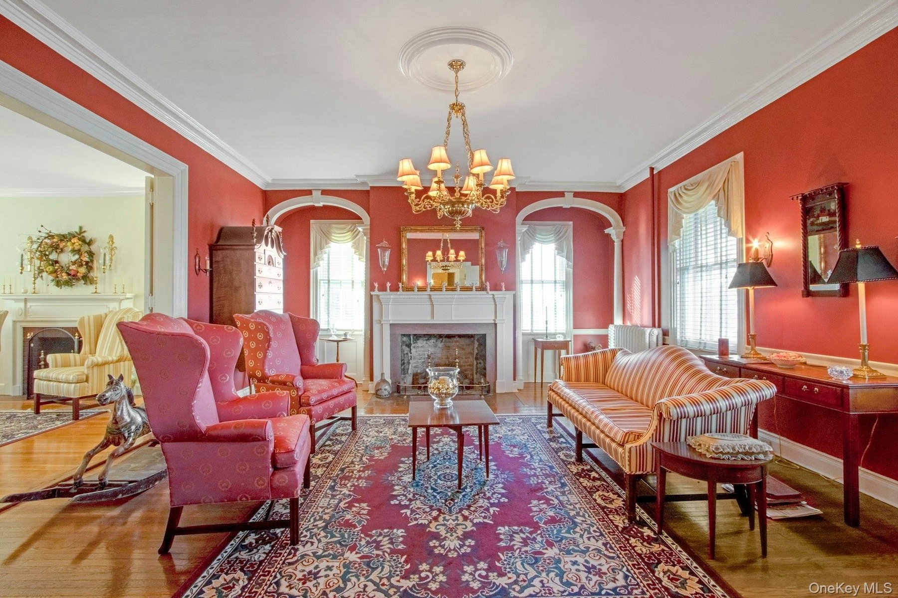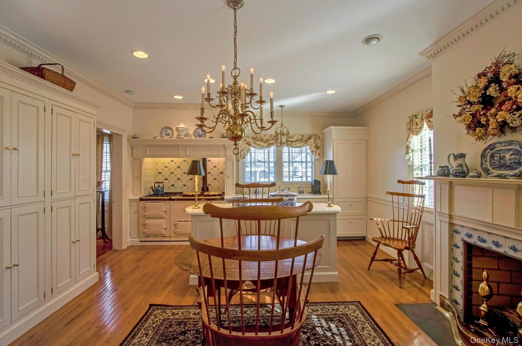 As you enter though the wide center hall, to one side is the living room, with custom-crafted archways over the windows and a warming fireplace. This leads into the adjoining sitting room with another gas fireplace. Across the hall is the banquet-sized formal dining room with the third fireplace and featuring an exquisite 12-arm custom Waterford chandelier. From here you enter the eat-in kitchen featuring the immense and warming AGA cast iron cooker and the fourth gas fireplace.