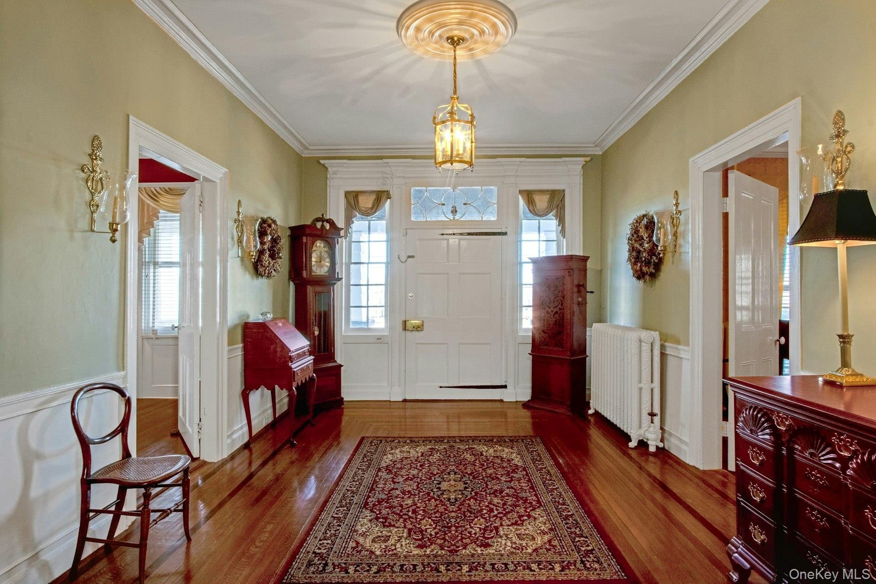 - Foyer entrance featuring radiator, crown molding, and wood finished floors