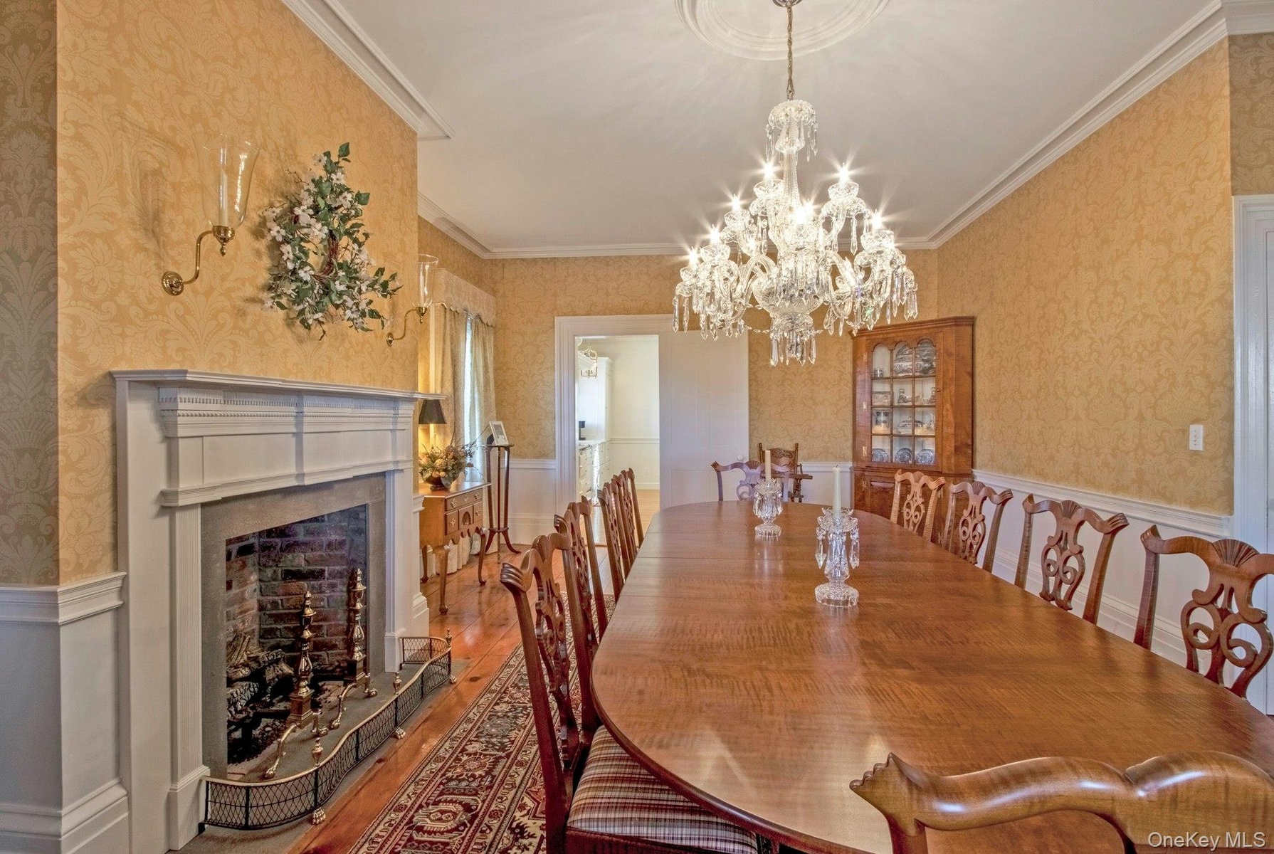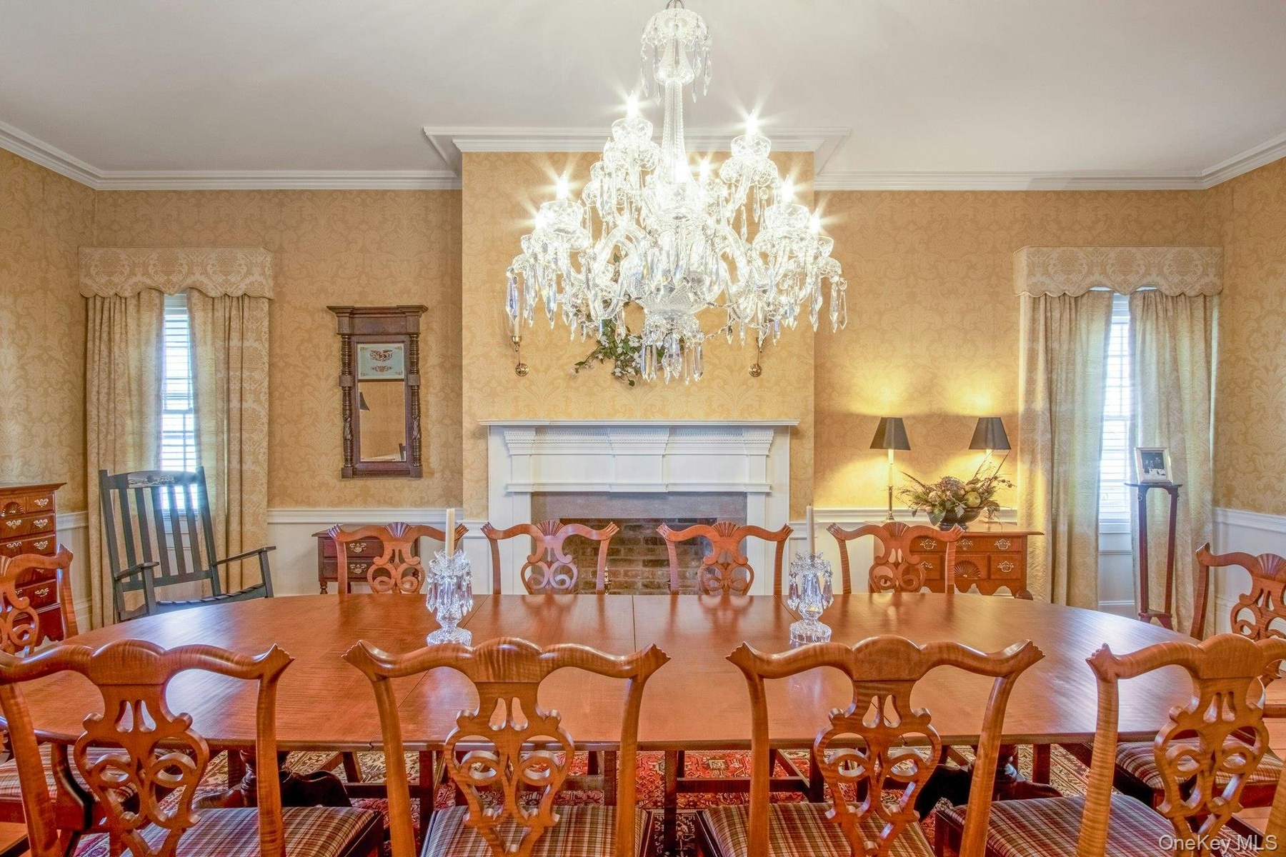 - Dining area featuring 12 arm Waterford custom chandelier and gas fireplace