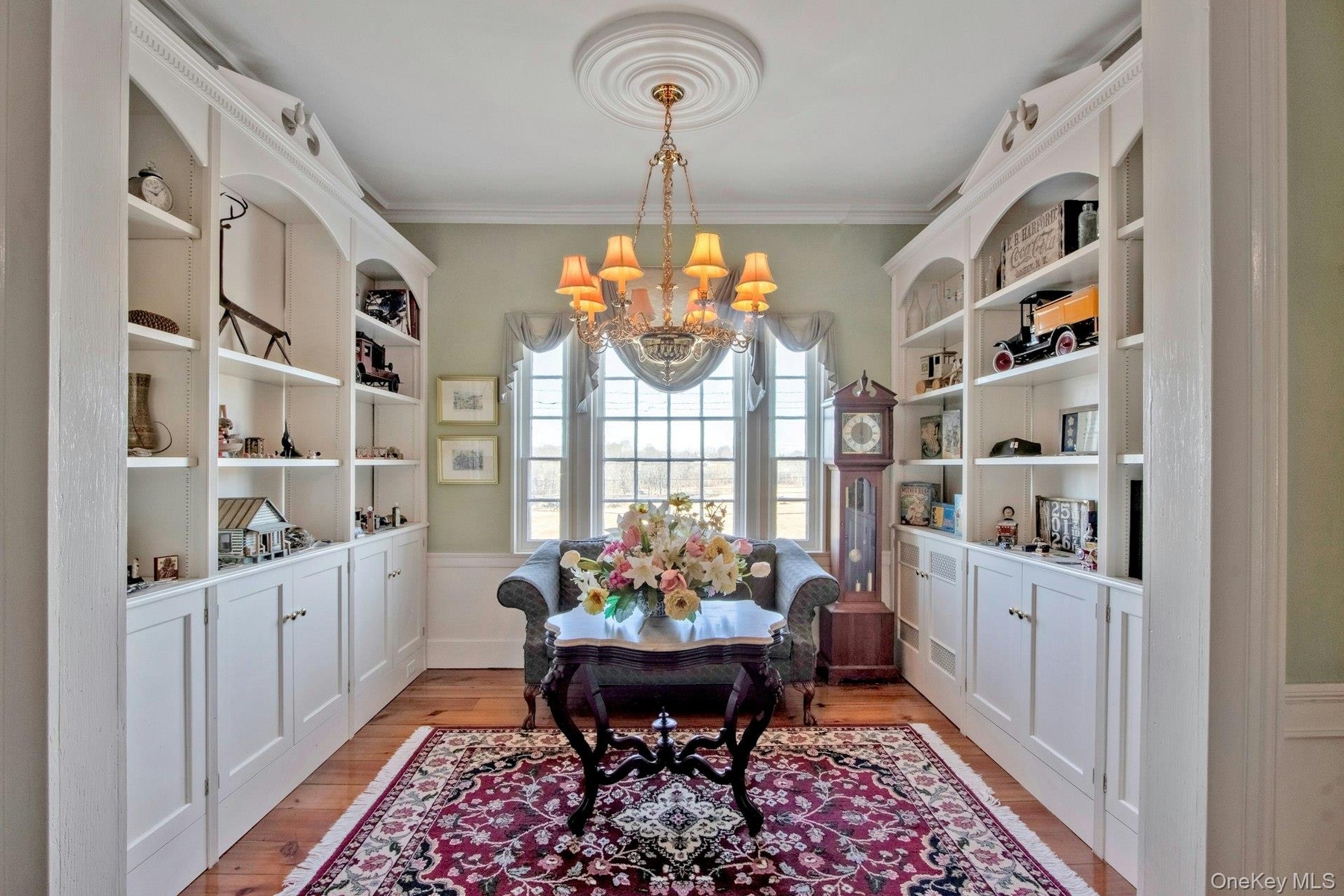 - Library with an inviting chandelier