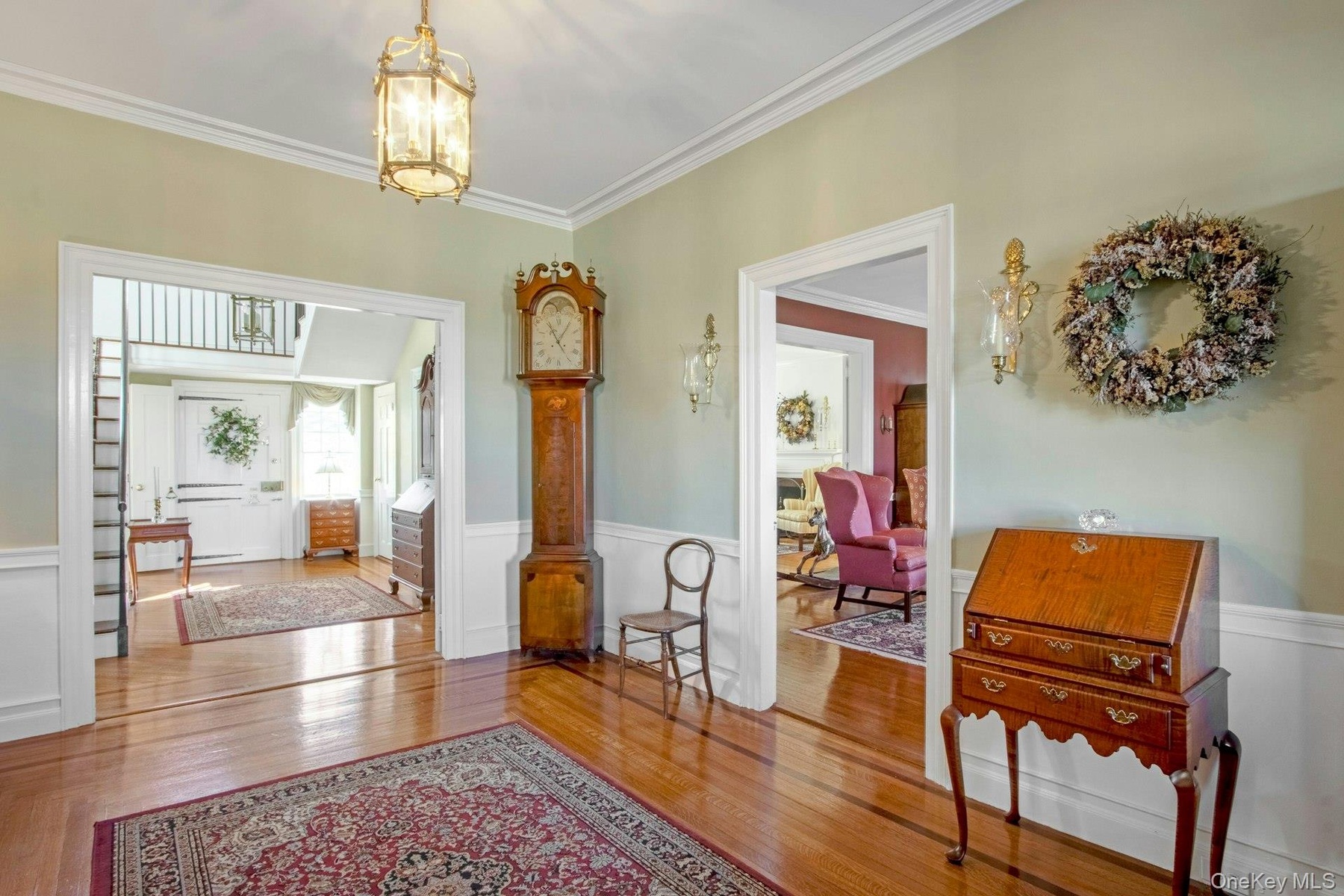 - Grand entrance foyer featuring a wainscoted wall, crown molding, wood finished floors, and an inviting chandelier