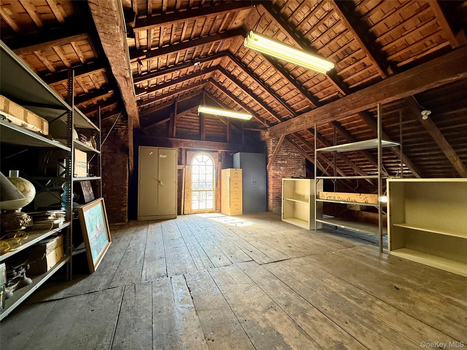 - Partial view of the unfinished attic with wood plank flooring