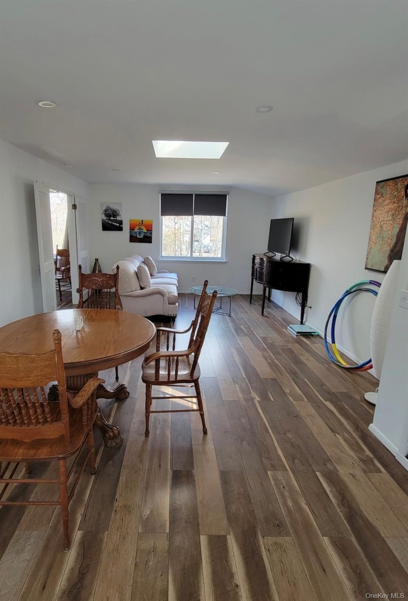 - Dining area with a skylight, ceiling fan, baseboards, and wood finished floors