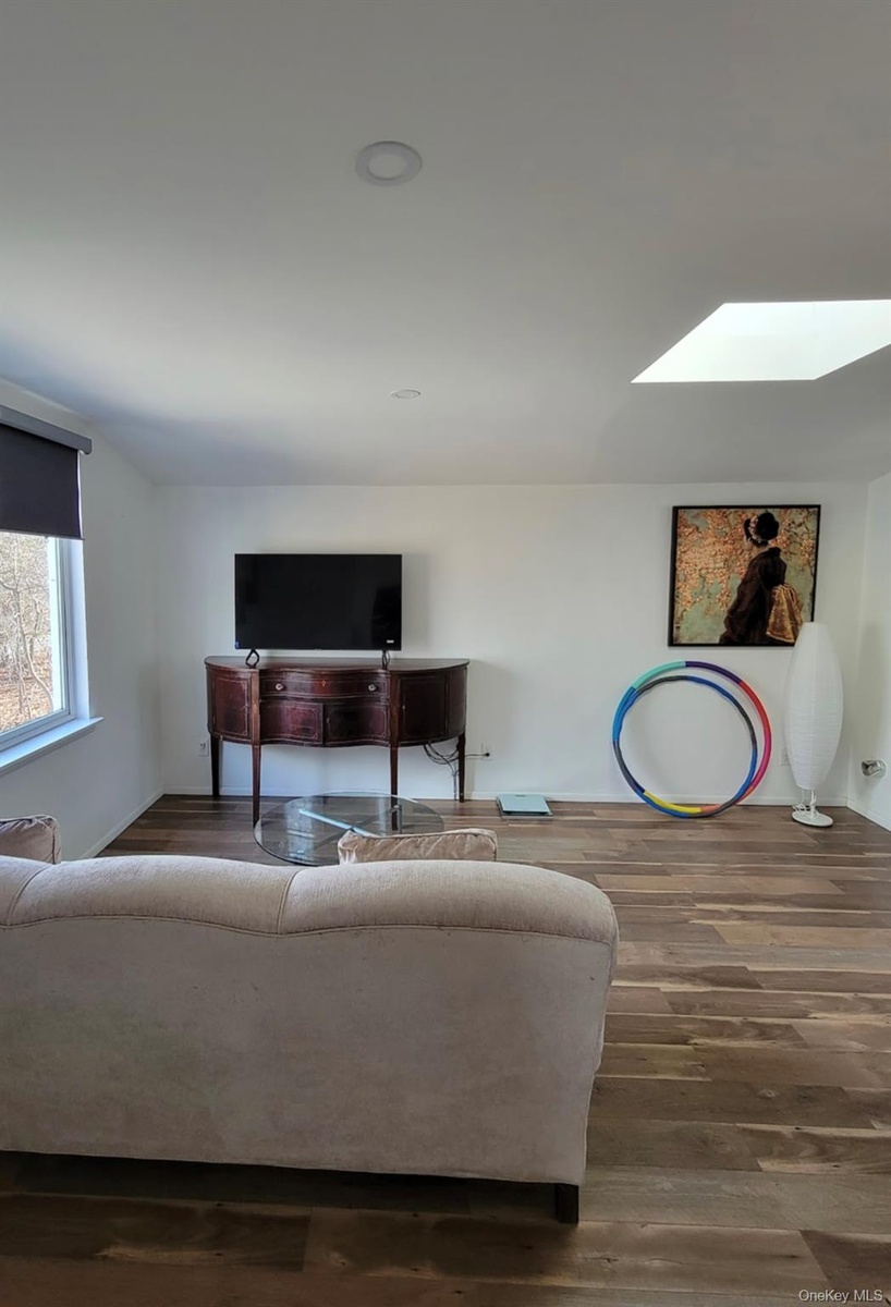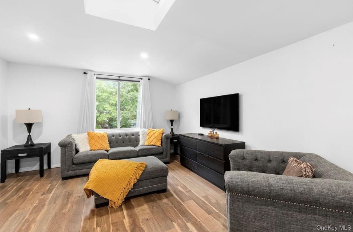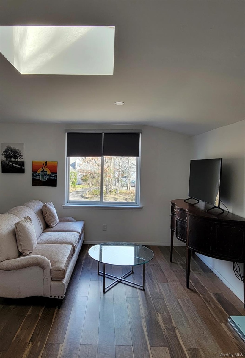 - Living room with vaulted ceiling with skylight, baseboards, recessed lighting, and wood finished floors