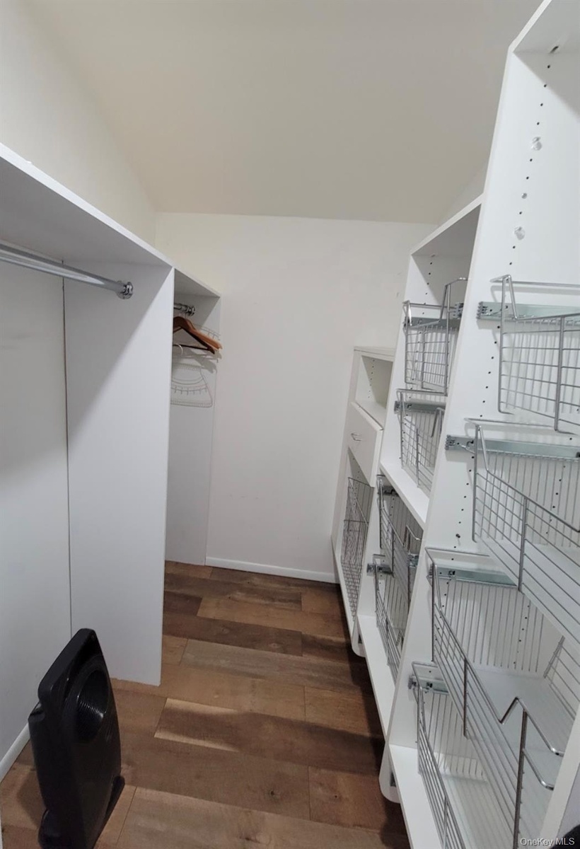 - Bedroom with vaulted ceiling, wood finished floors, visible vents, and baseboards