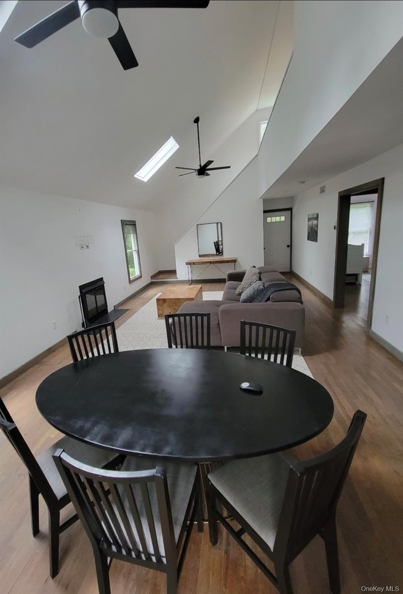 - Dining space featuring a skylight, baseboards, ceiling fan, wood finished floors, and high vaulted ceiling