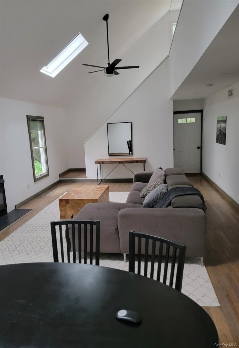 - Living area featuring a skylight, a ceiling fan, a fireplace with flush hearth, wood finished floors, and high vaulted ceiling