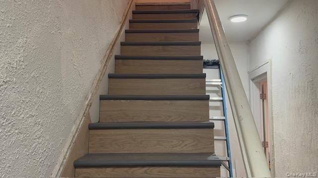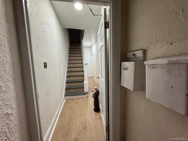 - Corridor featuring light wood-style floors, a textured wall, stairway, and baseboards