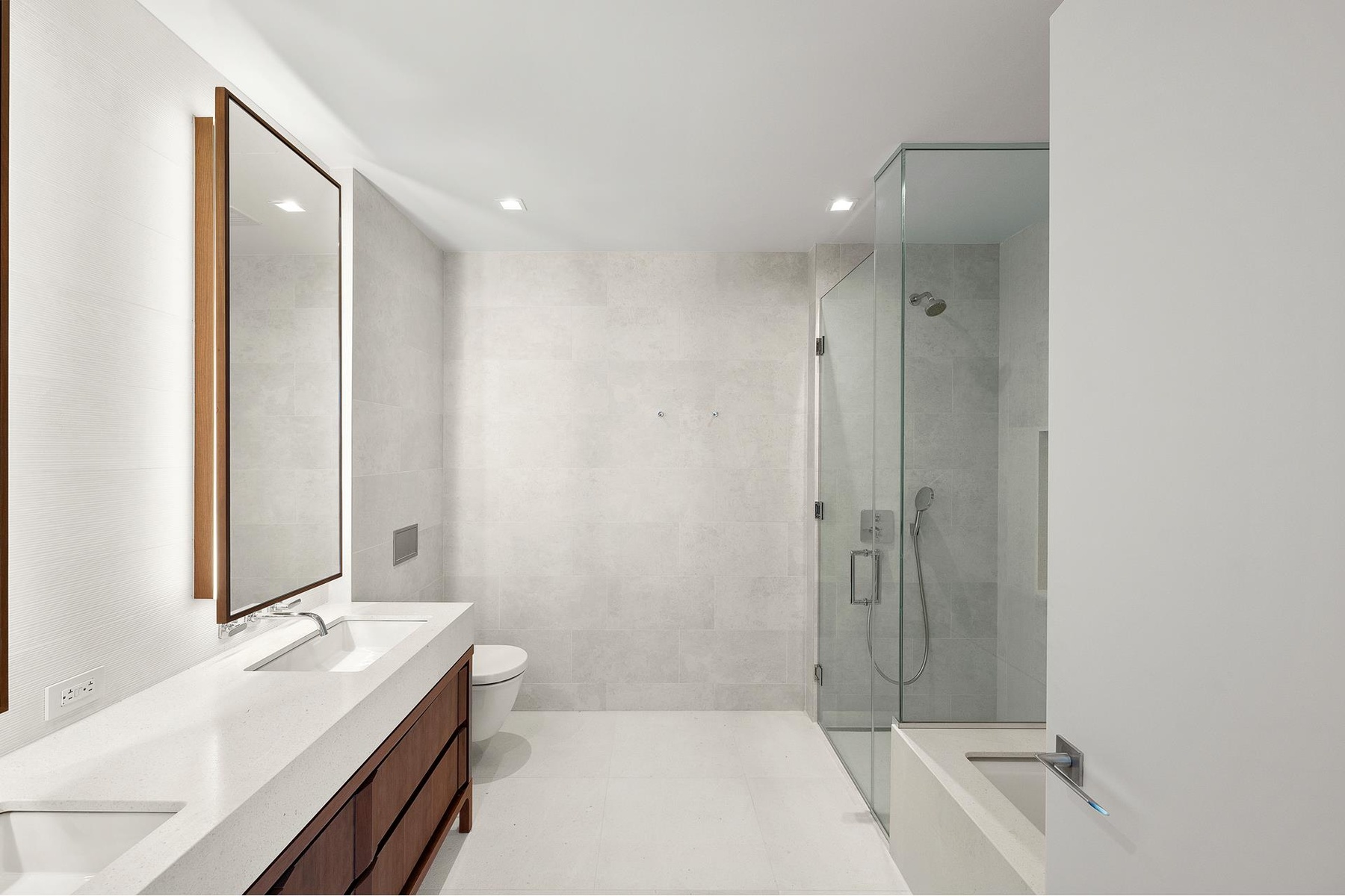 Secondary bedrooms are provided with ample closet space, while their en-suite and adjacent baths feature custom vanities, Italian Terrazzo floors, and Hansgrohe fixtures.