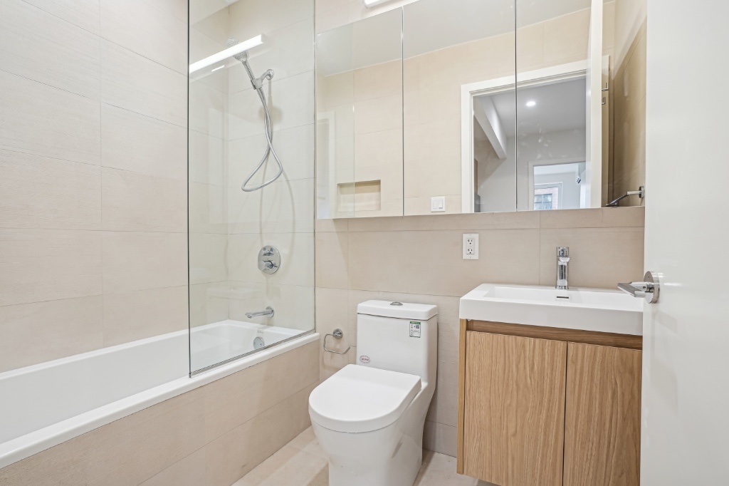 All homes feature sound-attenuated windows, in-unit washer and dryer and a stainless-steel appliance package. The kitchens are equipped with custom cabinetry, complemented by Pure White Caesarstone countertops. Bathrooms are condo-quality, offering deep soaking tubs, with custom vanities providing generous storage space. Every room comes with preinstalled solar shades, ensuring these apartments are truly move-in ready.