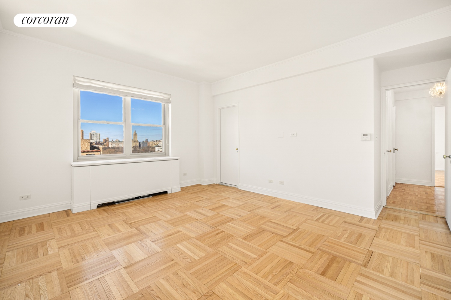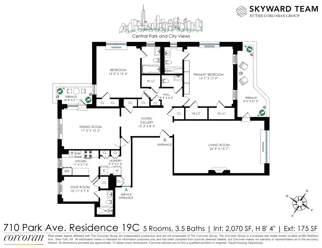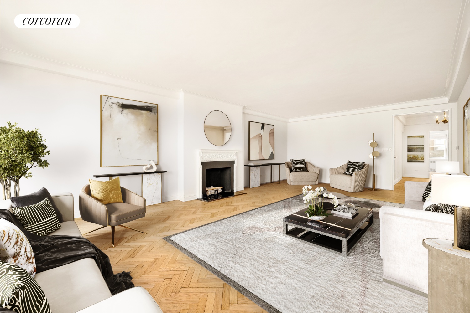Perched high above Park Avenue, this exceptional classic six home offers an abundance of natural light, with three exposures and two private terraces that offer sweeping central park and skyline views. A 25-foot entrance gallery opens to a corner living room that epitomizes refined living-bathed in sunlight and unobstructed park views. Herringbone hardwood floors, a decorative fireplace, and a grand 20-foot formal dining room, each with double exposures add to an air of timeless elegance.
