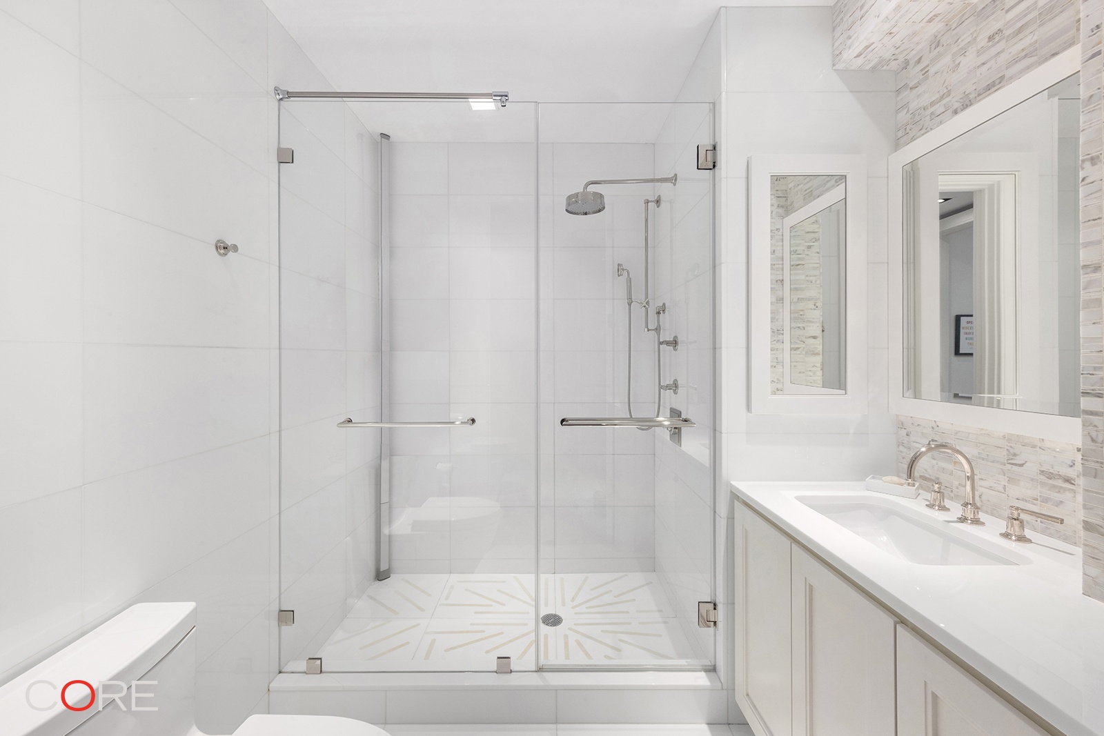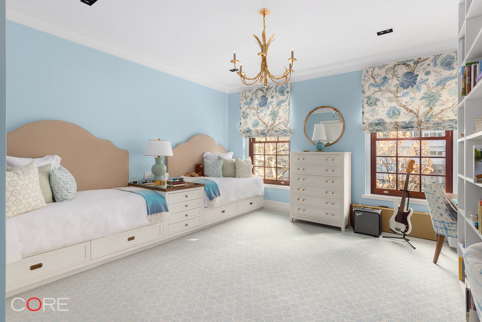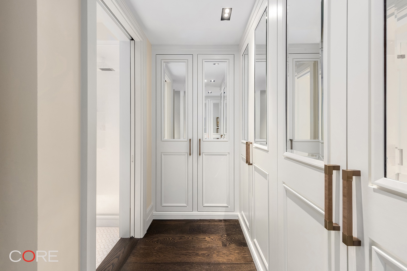 The lower level, currently utilized as a gym, has endless recreational space and flexibility, in addition to a second powder room and an abundance of storage. Off the gym is the laundry room that exceeds expectations with two stacked washers and dryers, a full sink, shelving, and a large closet. Additional comforts include recessed electric blackout blinds in the bedrooms, a video intercom security system, and multi-zone central air-conditioning.