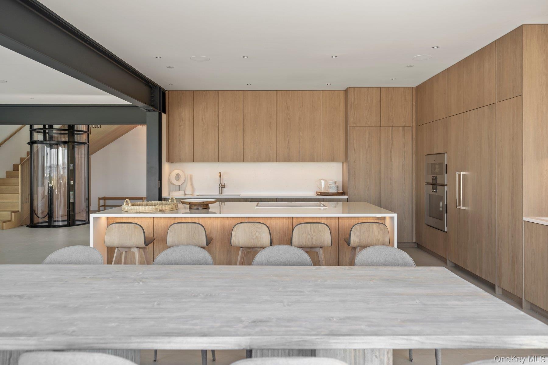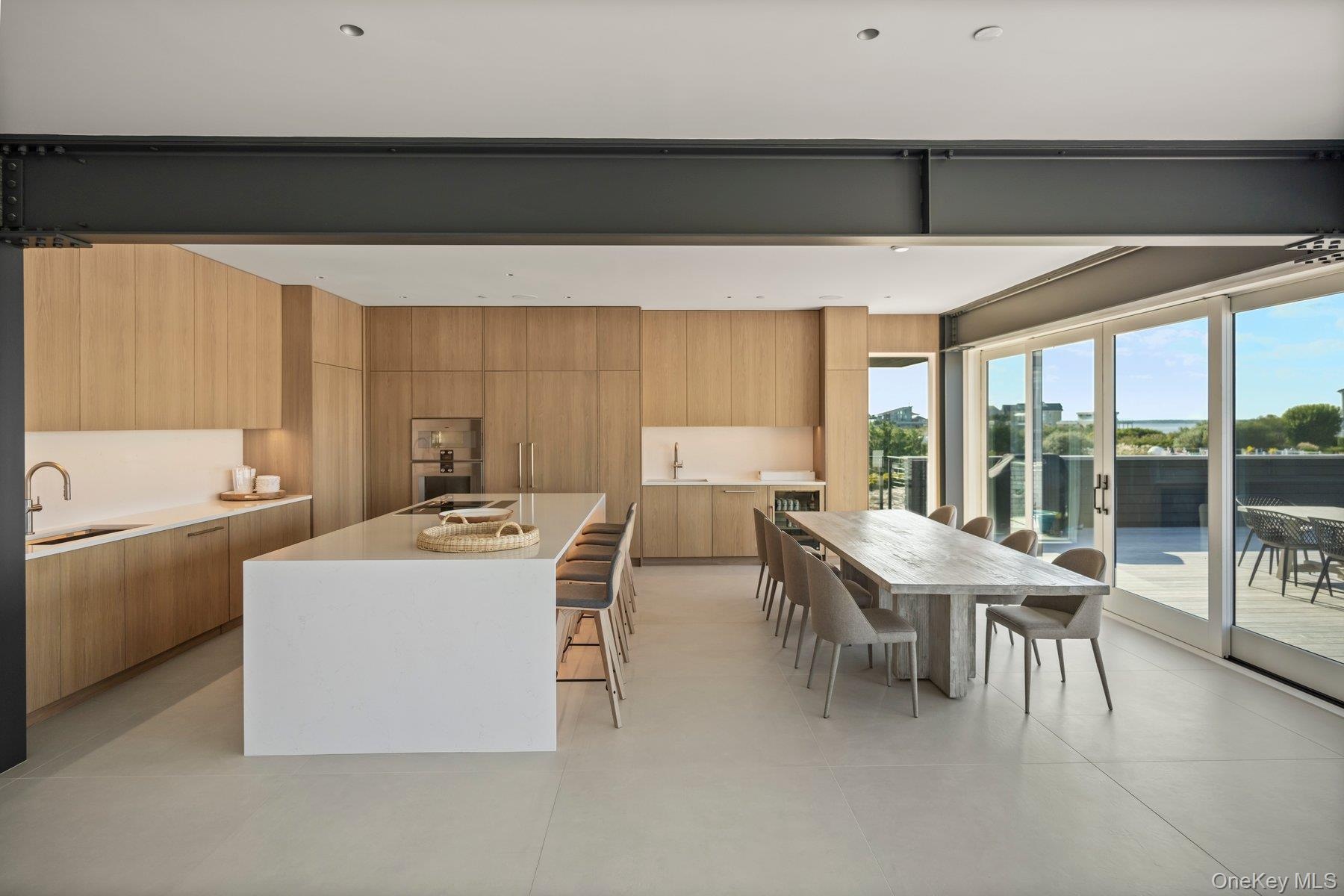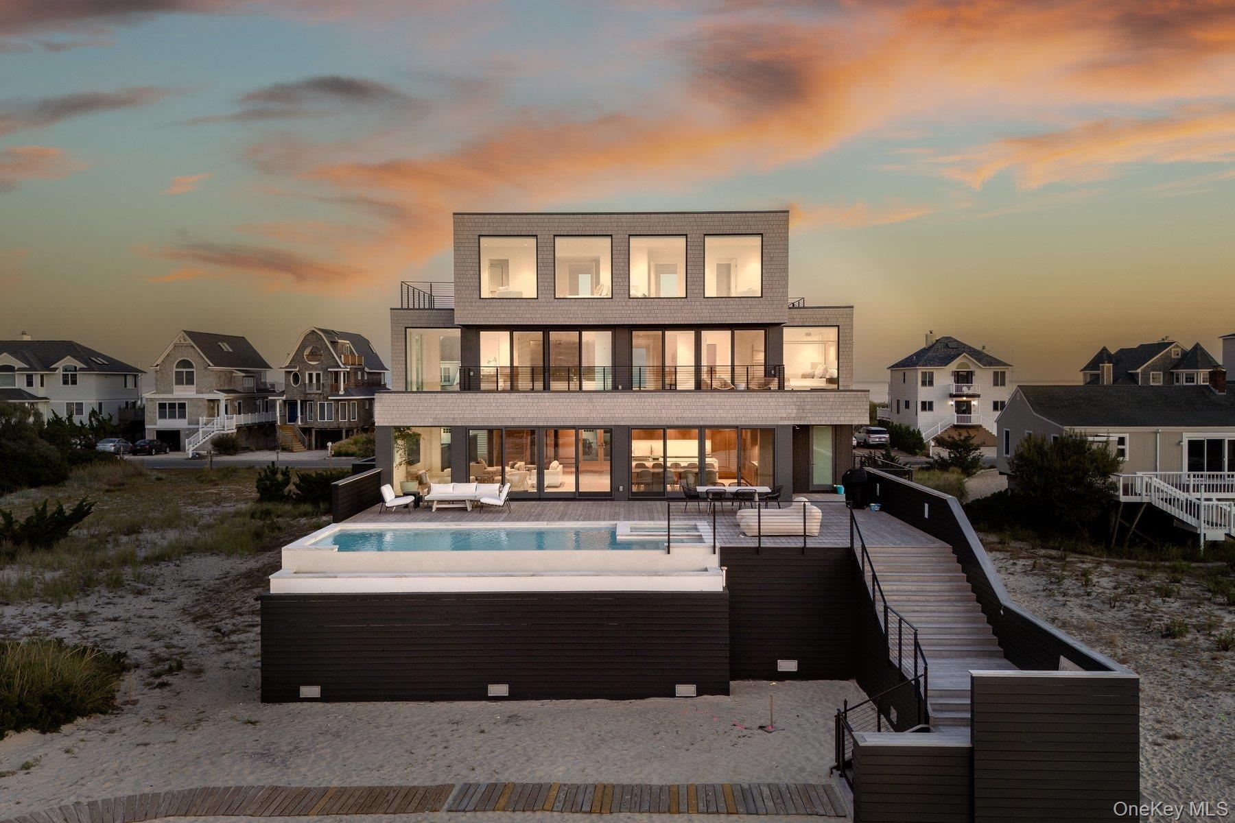 Welcome to Curving Dunes, a stunning Hamptons retreat built to perfection and expertly designed by First Dunes in collaboration with The Up Studio. This 6,300 sq ft masterpiece spans three floors, offering seven bedrooms, seven bathrooms, and two powder rooms, all designed to elevate your beach living experience. Step into the grand foyer, where serene, neutral tones reflect the surrounding Hamptons beauty. The open-concept layout flows effortlessly from the living and dining areas to a chef's kitchen, equipped with top-of-the-line Gaggenau appliances and a spacious dining island-perfect for hosting any occasion. The living room opens up to your private outdoor haven, featuring an expansive deck with a heated infinity pool and integrated spa, all overlooking panoramic bay views. A separate guest residence offers privacy and flexibility, doubling as a home office or wellness suite with a sauna, cold plunge, experience shower, and yoga studio. The second floor houses the primary suite and two additional bedrooms, each with its own ensuite. The primary bathroom features a luxurious steam shower, soaking tub, and a private balcony with stunning bay views. Ascend via the unique transparent pneumatic elevator to the third floor, where two more ensuite bedrooms, a loft with a chic wet bar, and an expansive rooftop deck offer 360-degree views of the ocean and bay-perfect for savoring sunsets and sunrises. The meticulously landscaped grounds lead to a two-car garage with additional storage space. Enjoy exclusive access to Moriches Bay and the Atlantic Ocean, inviting endless Hamptons adventures. Welcome to Curving Dunes, where every detail reflects unmatched craftsmanship and elegance.