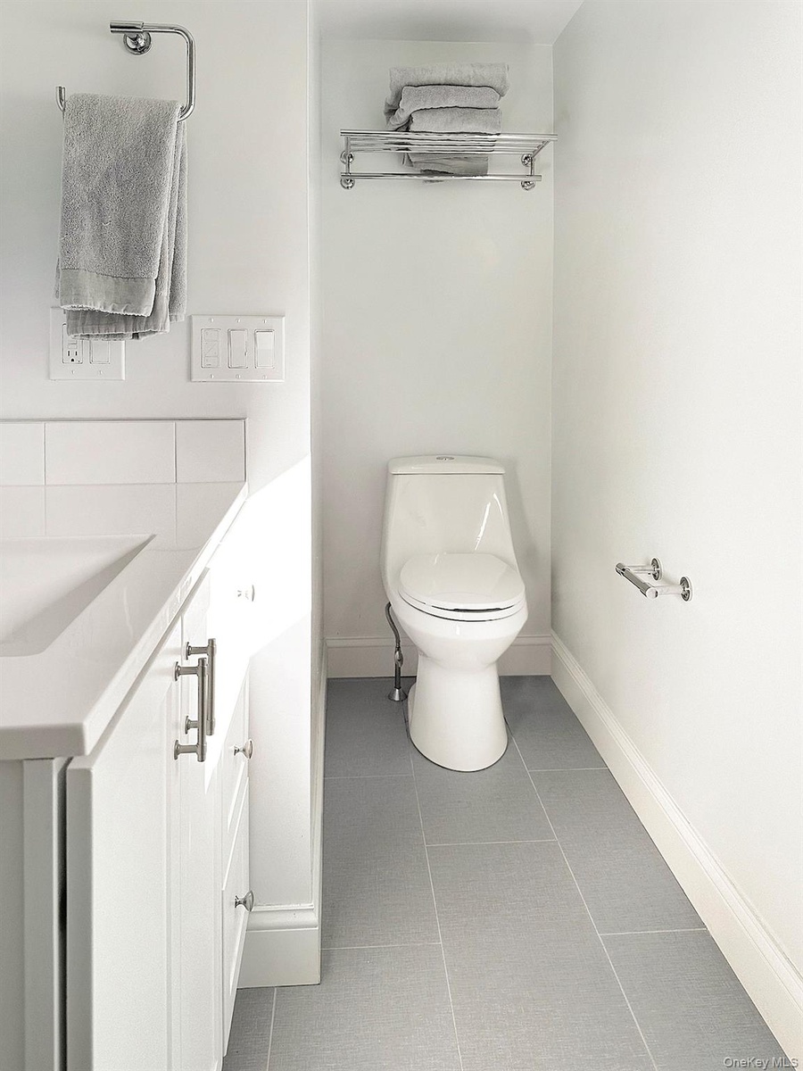 - Half bath featuring toilet, tile patterned flooring, baseboards, and a sink