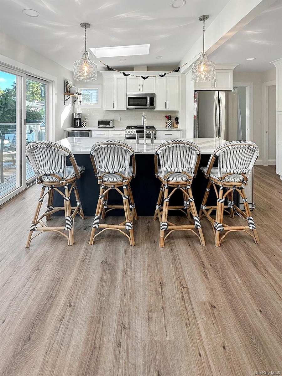 - Kitchen featuring a skylight, white cabinets, decorative backsplash, stainless steel appliances, and a sink