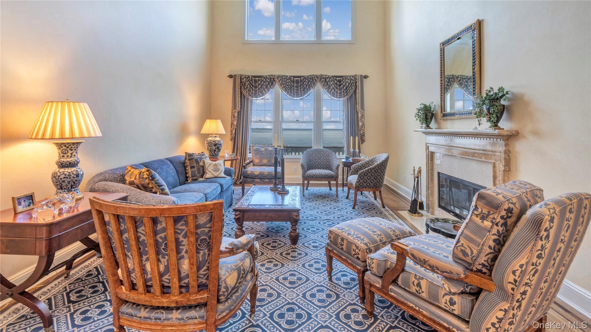 - Living Room Featuring Walls of Glass Overlooking LI Sound, Double Height Ceilings, Fireplace and Attractive Floors