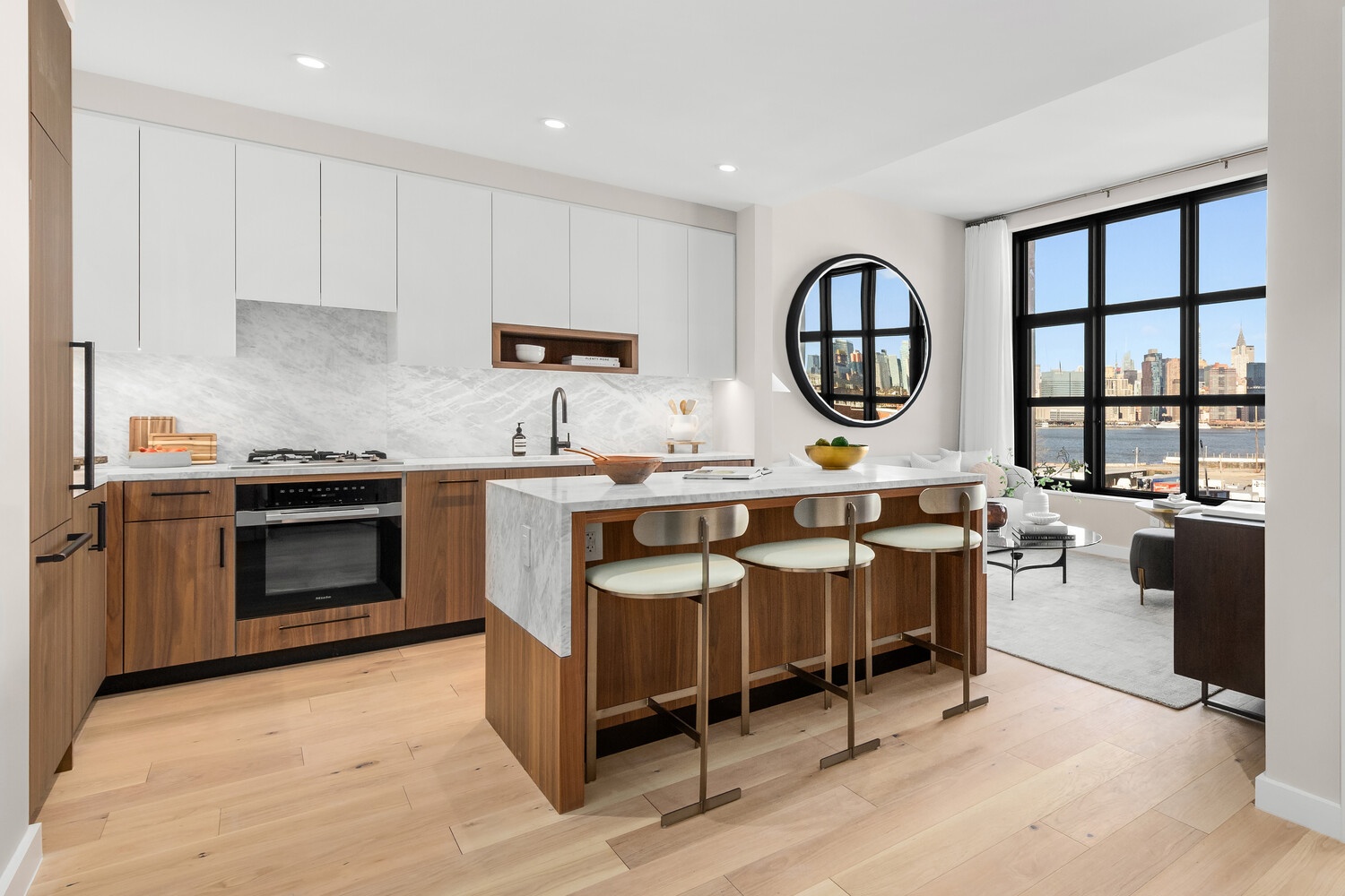 The home begins with an open-plan living room, dining room, and kitchen saturated with northern light. The kitchen juxtaposes honed Italian Dolit marble slabs with custom made, imported two-tone cabinets and drawers. It features a huge eat-in island and a full suite of integrated Miele appliances. The king-size primary suite boasts a massive walk-in closet and a stylish en-suite bathroom with a glass-enclosed walk-in Signature rain shower. The second bedroom has a reach-in closet and easy access to a full bathroom. A Bosch washer and dryer completes the home.
