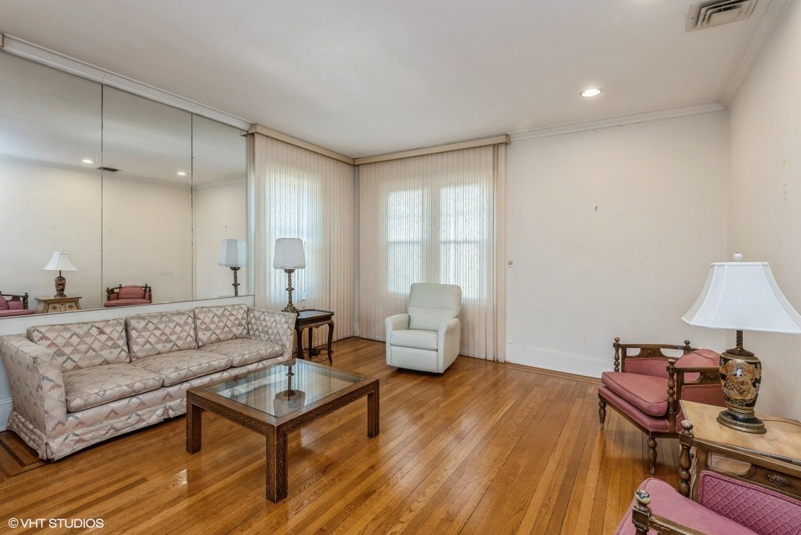 - Living area with hardwood / wood-style floors, radiator heating unit, and crown molding