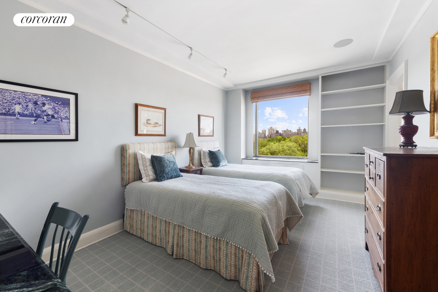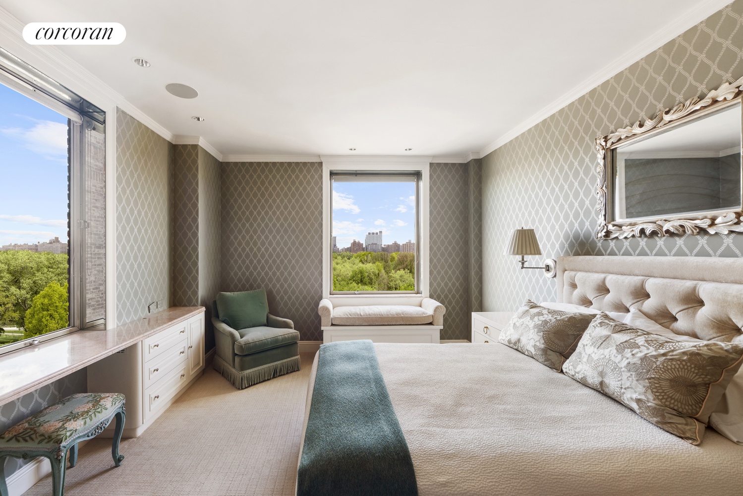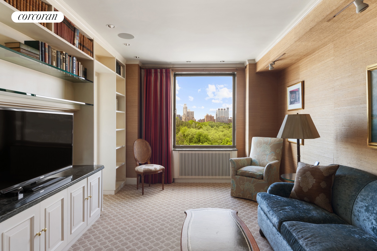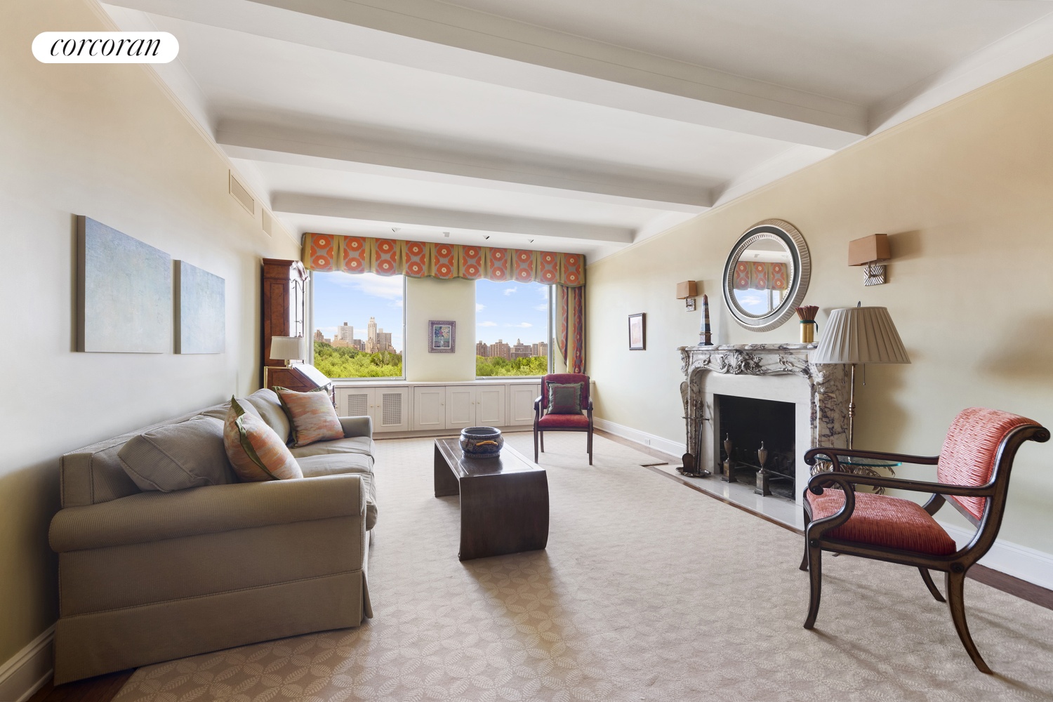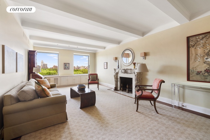 The expansive living room is centered on a wood-burning fireplace and graced with oversized picture windows, flooding the space with natural light and offering a front-row seat to the changing seasons of the Park. The apartment's three bedrooms all have stunning Central Park views-one of which currently serves as a den/library.