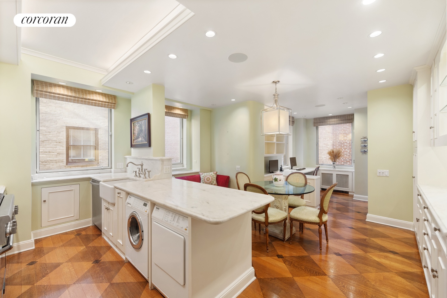 Next to the large Formal Dining Room, a butler's pantry leads to the windowed eat-in kitchen with beautiful built-in cabinets, a small home office and a powder room, as well as a washer/dryer.