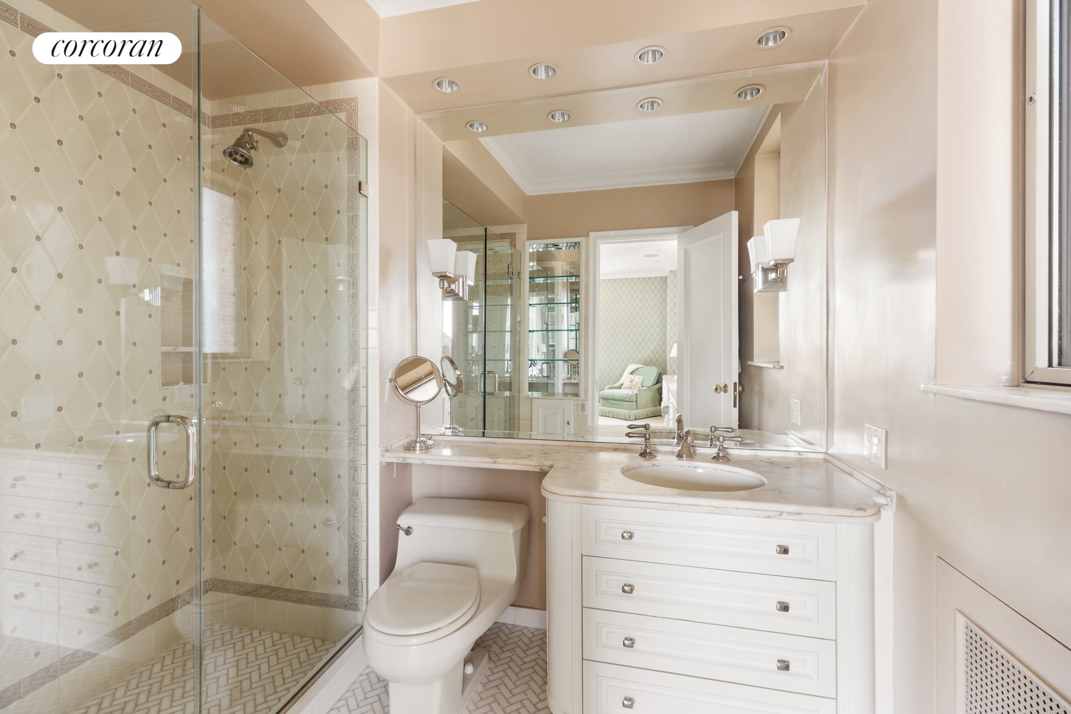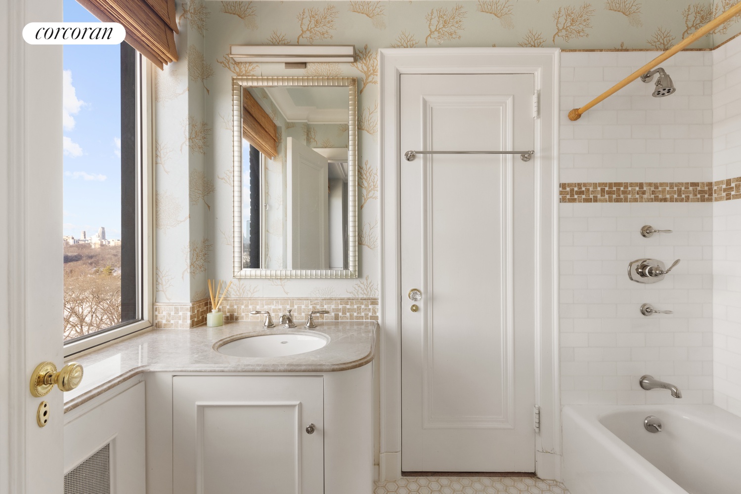 The corner primary suite features ample closets along the entrance hall and a full en-suite bathroom. The windows look South and West over the Park.