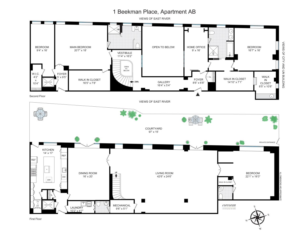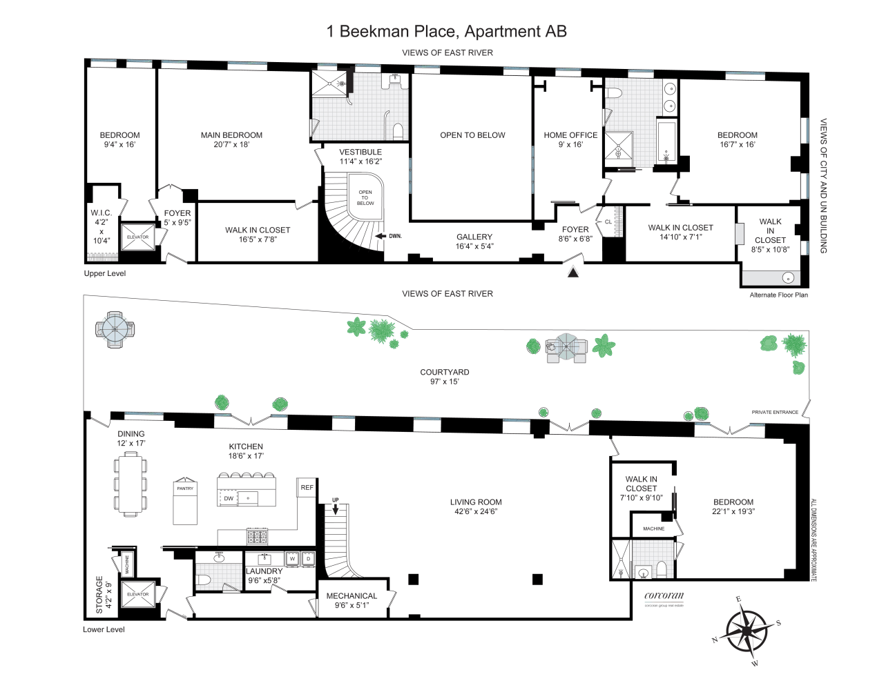 Rarely available, magnificent trophy maisonette home with spectacular East River views in one of Manhattan's legendary co-ops located at the exclusive 1 Beekman Place. This rare and unique duplex garden apartment redefines elegance and sophistication. Spanning 11 exquisite rooms, the residence features five lavish bedrooms, a wood-paneled library, a formal dining room, and a jaw-dropping 24'6" x 42'6" living room with soaring double-height ceilings. A private elevator enhances convenience by allowing seamless access between floors.
