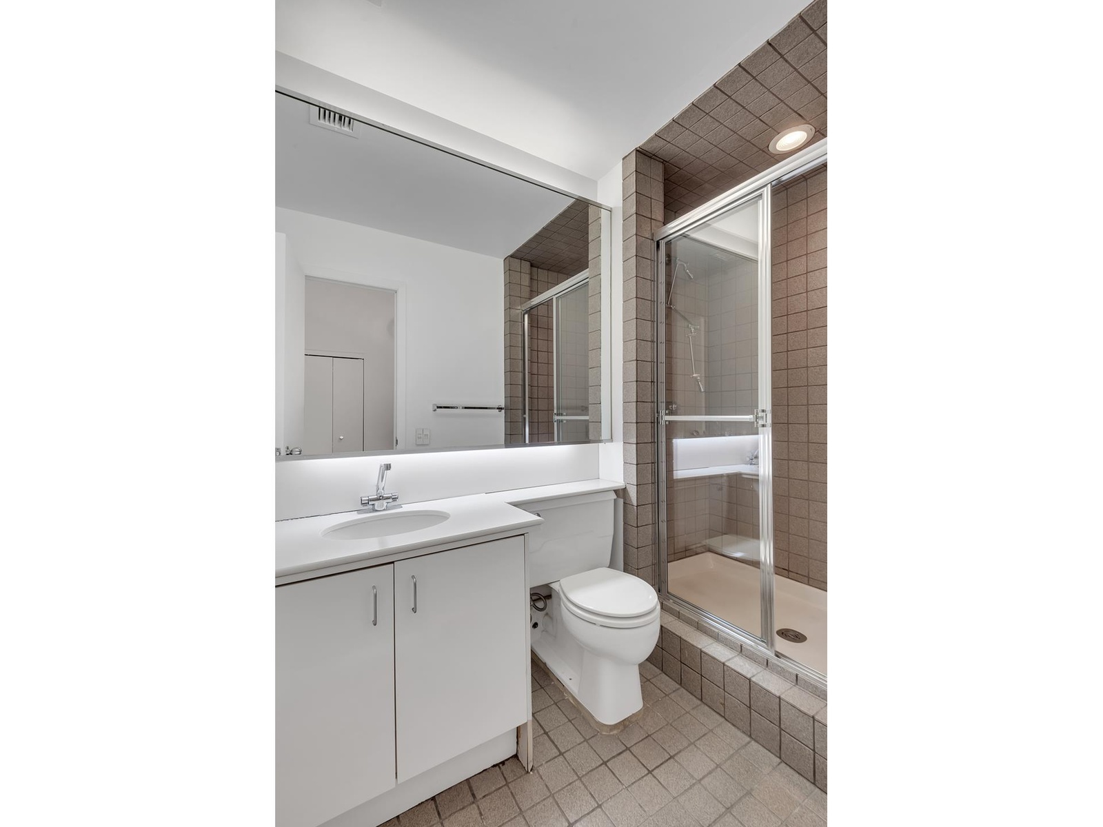 The lower level of this apartment which features 13 feet ceilings includes an office/media room/or guest room with there are 3 large closets with additional storage above, another full bath and second entrance to the apartment.