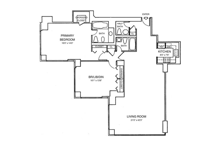 As you enter through the foyer of this sophisticated corner two bedroom, two and one-half bathroom apartment, you step into a spacious sunlit corner living room large enough to accommodate a dining and entertainment area. Both bedrooms are to the right of the foyer and each sits on a corner of the building assuring you plenty of light through enormous windows. The primary bedroom has an en-suite bath and an oversized closet. The second bedroom/library, which also has an oversized closet, is positioned across the hall from the second bathroom. Hardwood flooring runs throughout the apartment and a powder room is discreetly tucked off of the entry.
