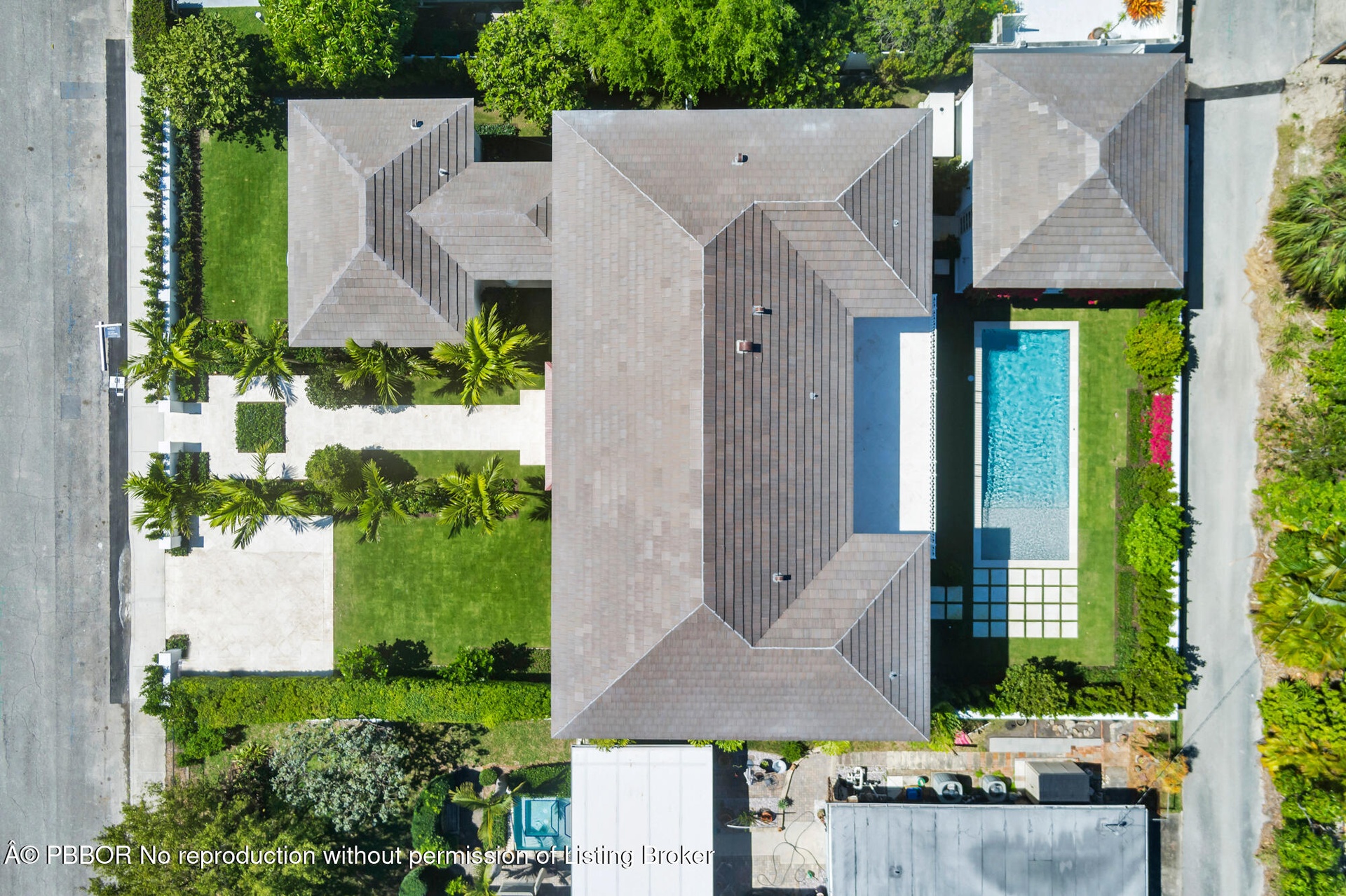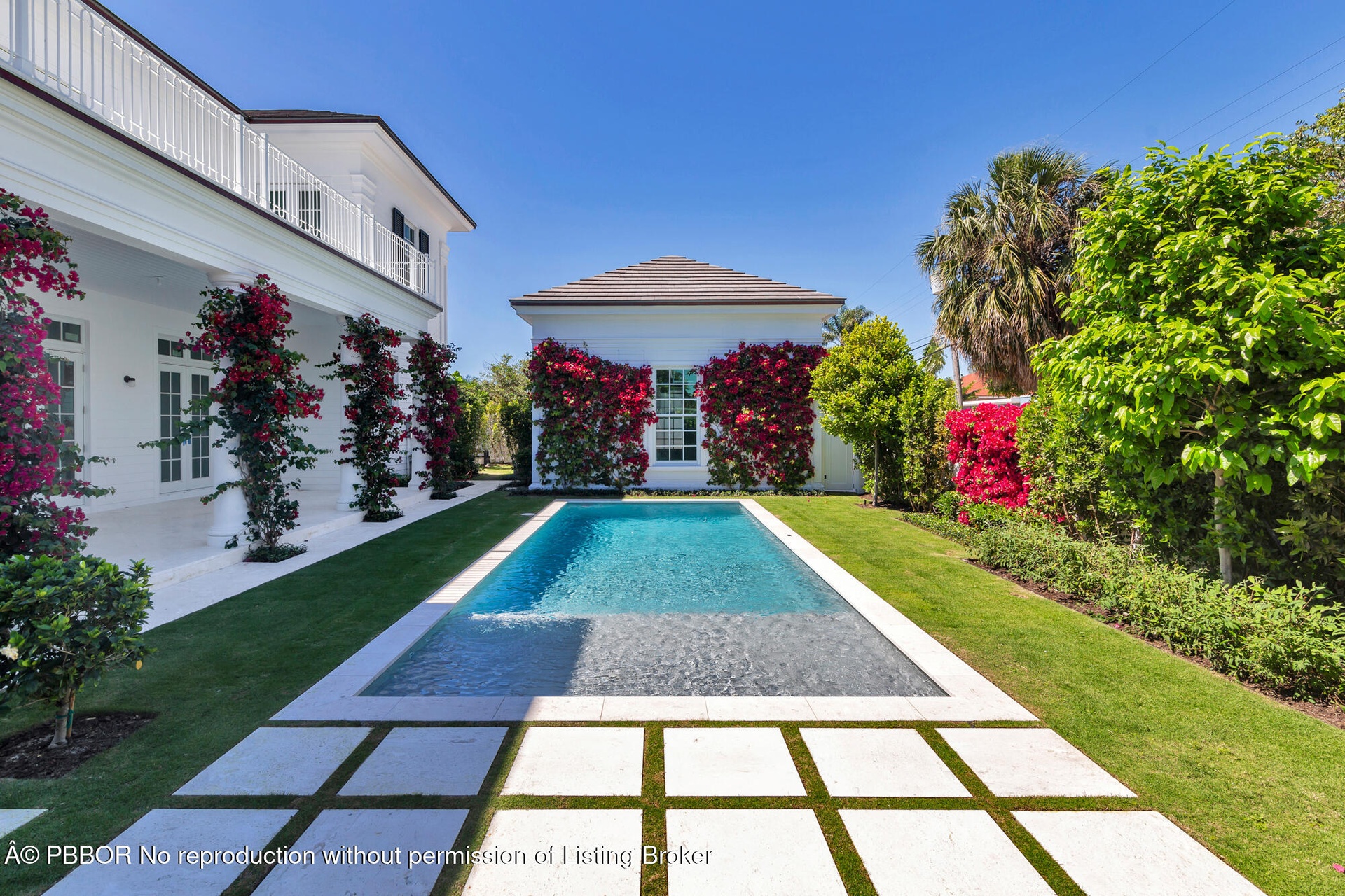 The primary suite opens to a spacious terrace overlooking the pool and features two walk-in closets, dual sinks, a soaking tub, a walk-in shower, and polished nickel hardware. Three additional bedrooms are located upstairs, with two opening to the terrace.