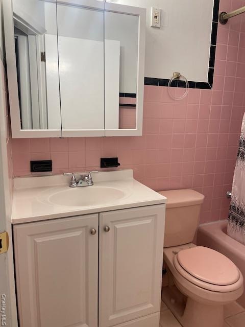 - Bathroom with shower / tub combo, toilet, tile walls, and vanity