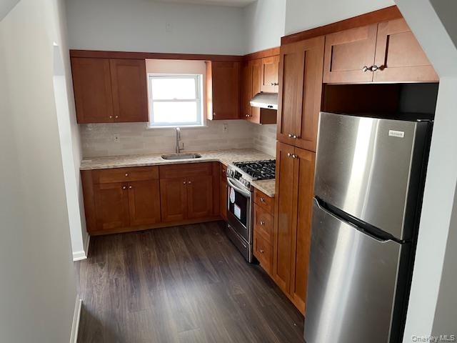 - Kitchen with a sink, brown cabinets, and appliances with stainless steel finishes