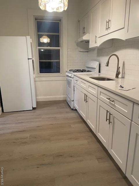 - Kitchen with a sink, fridge, ventilation hood, white cabinets, and stove