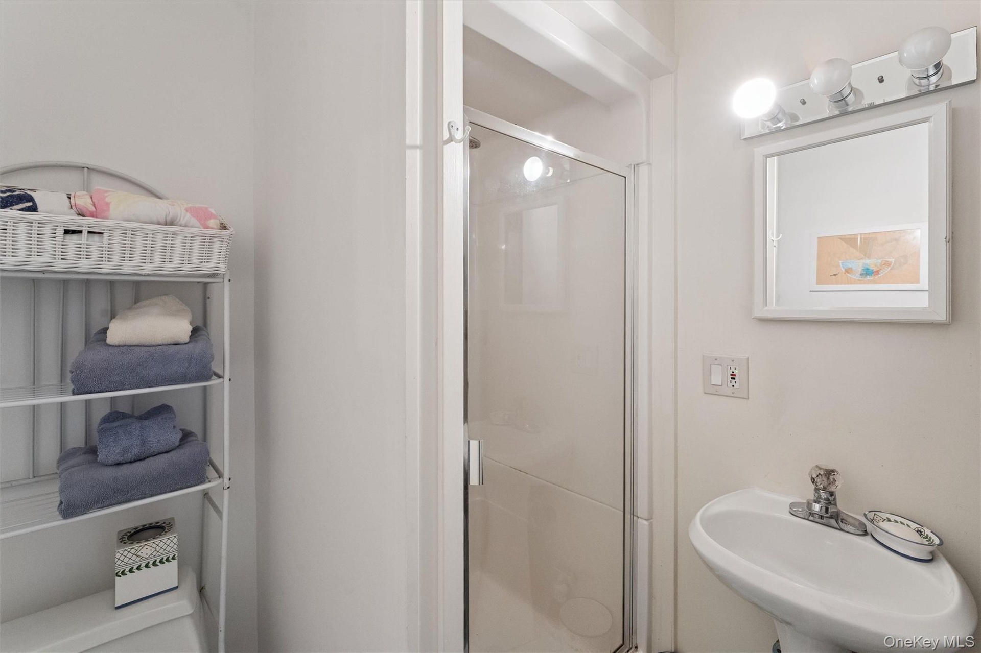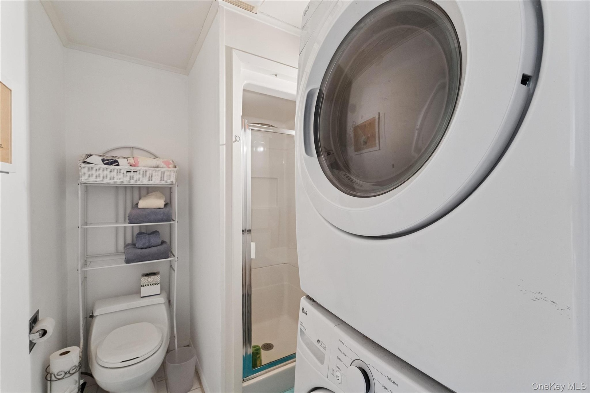 - Full bathroom featuring stacked washer and clothes dryer, toilet, a stall shower, and crown molding