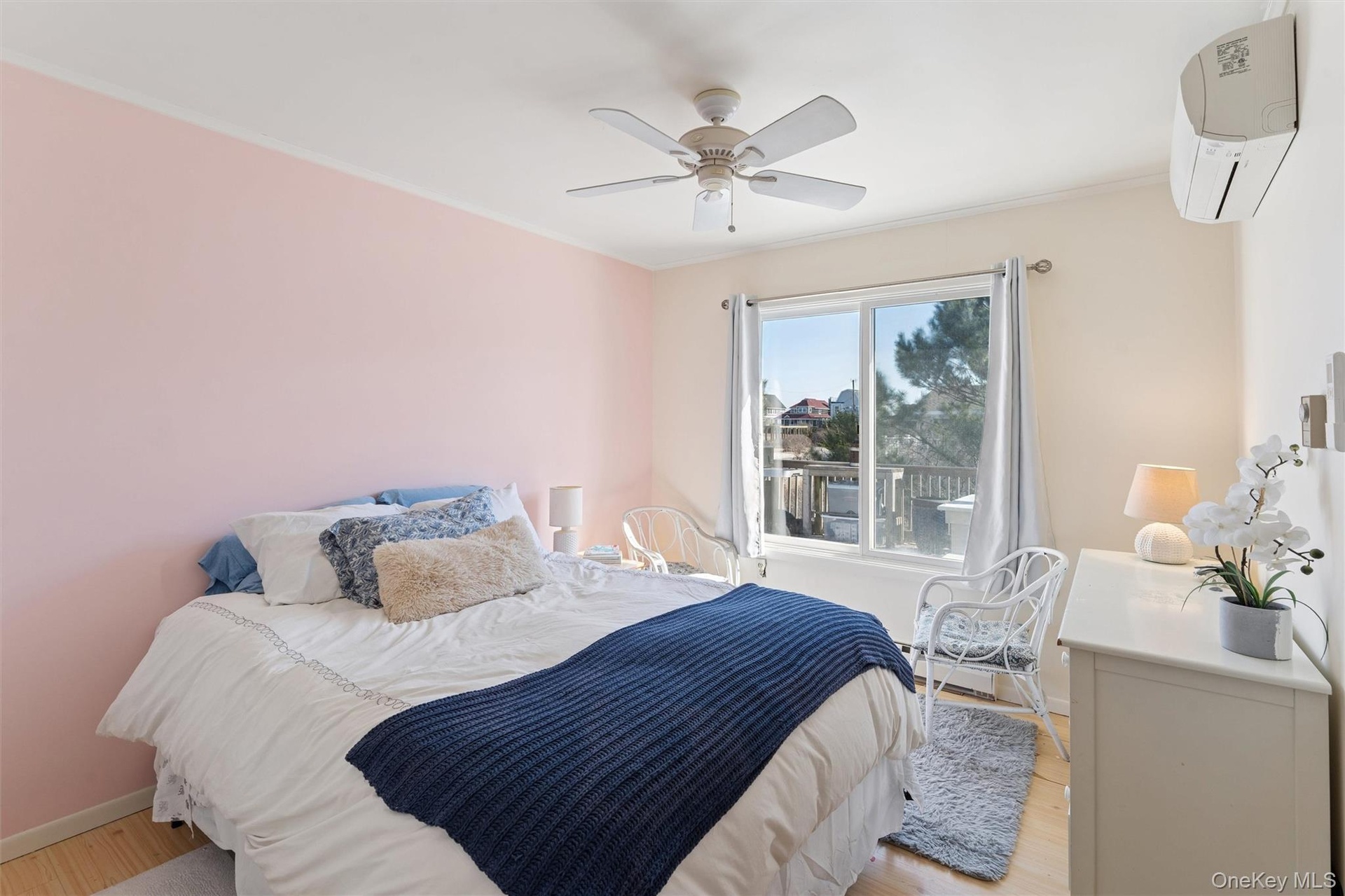- Bedroom featuring ornamental molding, wood finished floors, a wall mounted AC, a ceiling fan, and a baseboard radiator
