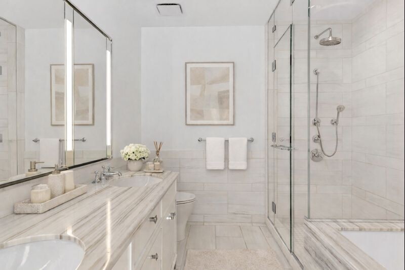 The king-sized primary suite offers two oversized windows, a custom walk-in closet, and a five-fixture marble bath with soaking tub, glass shower, double vanity, and heated floors. Additional highlights include an in-unit washer/dryer and generous storage throughout. Select photos virtually staged.