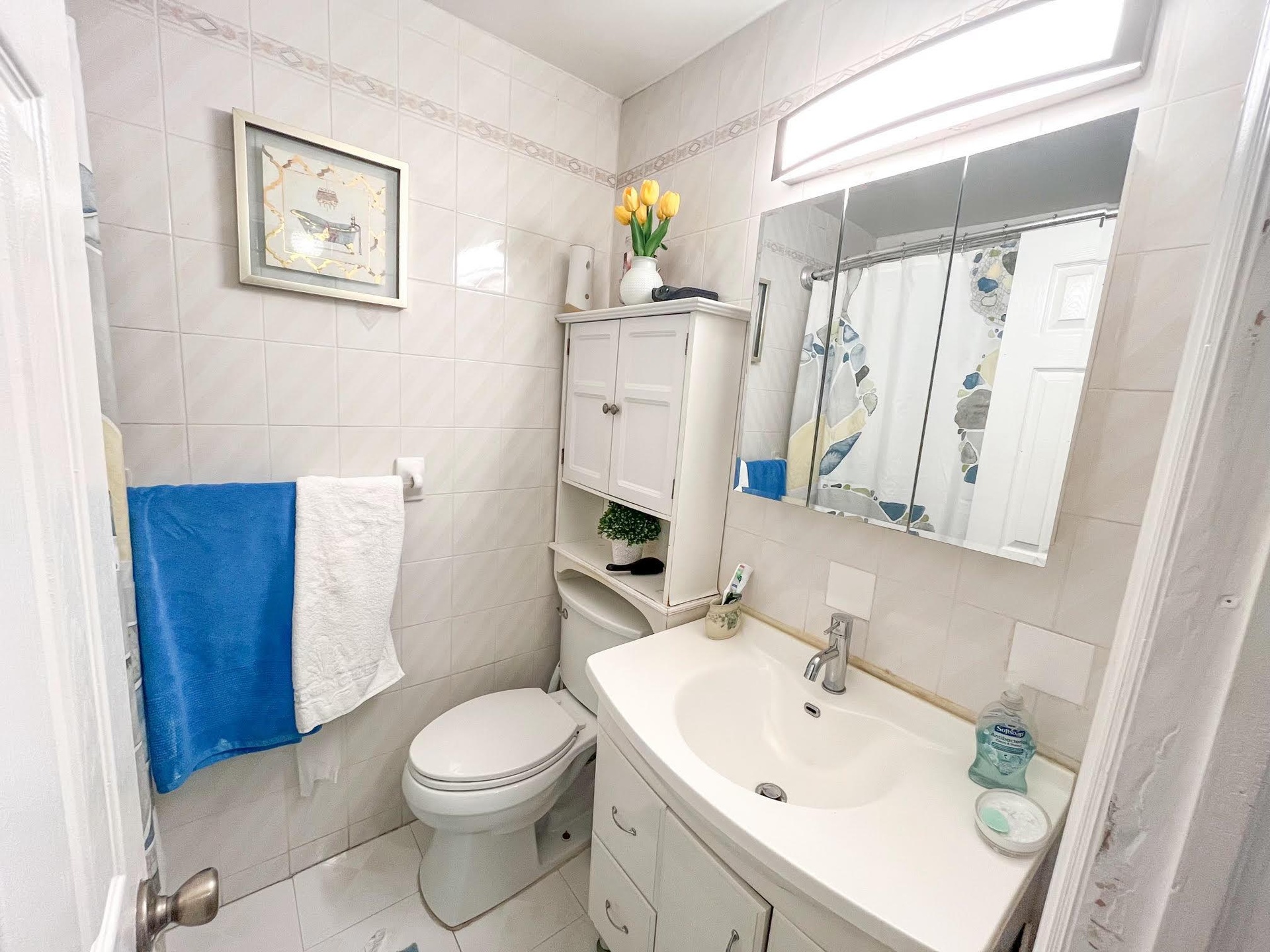 - Full bath with vanity, tile walls, toilet, and tile patterned flooring