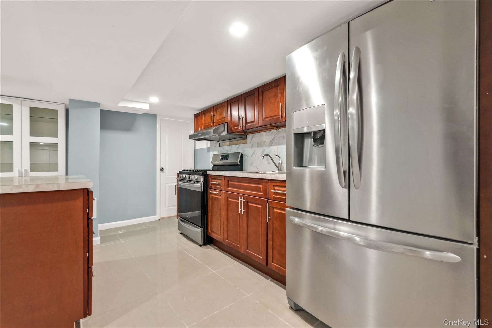 - Kitchen with baseboard heating, stainless steel appliances, light tile patterned floors, light countertops, and recessed lighting