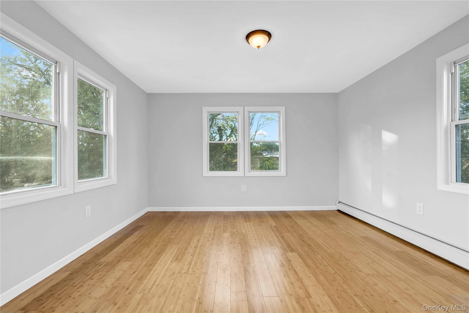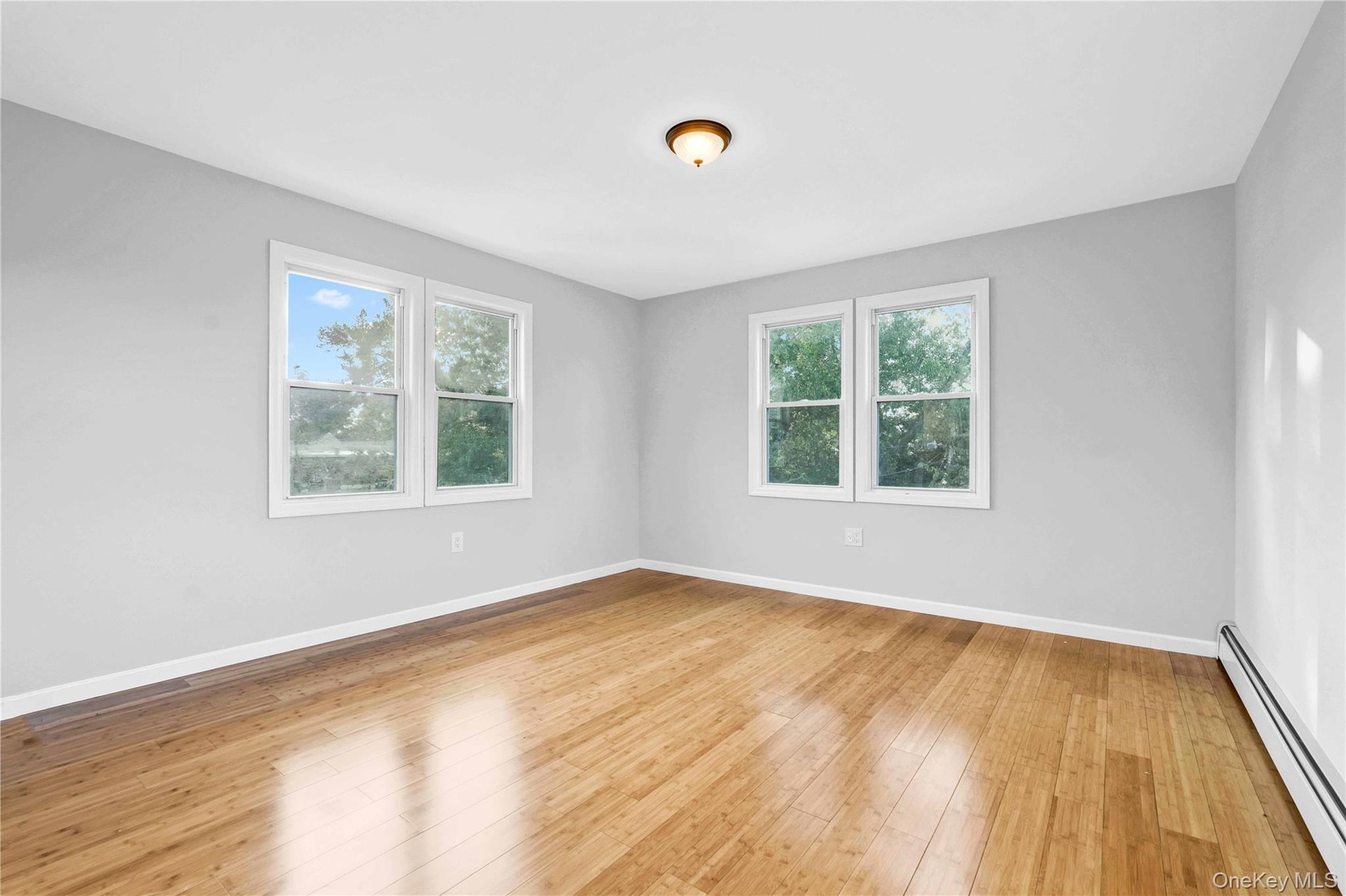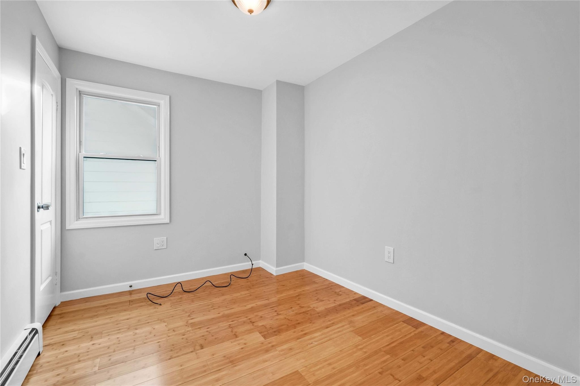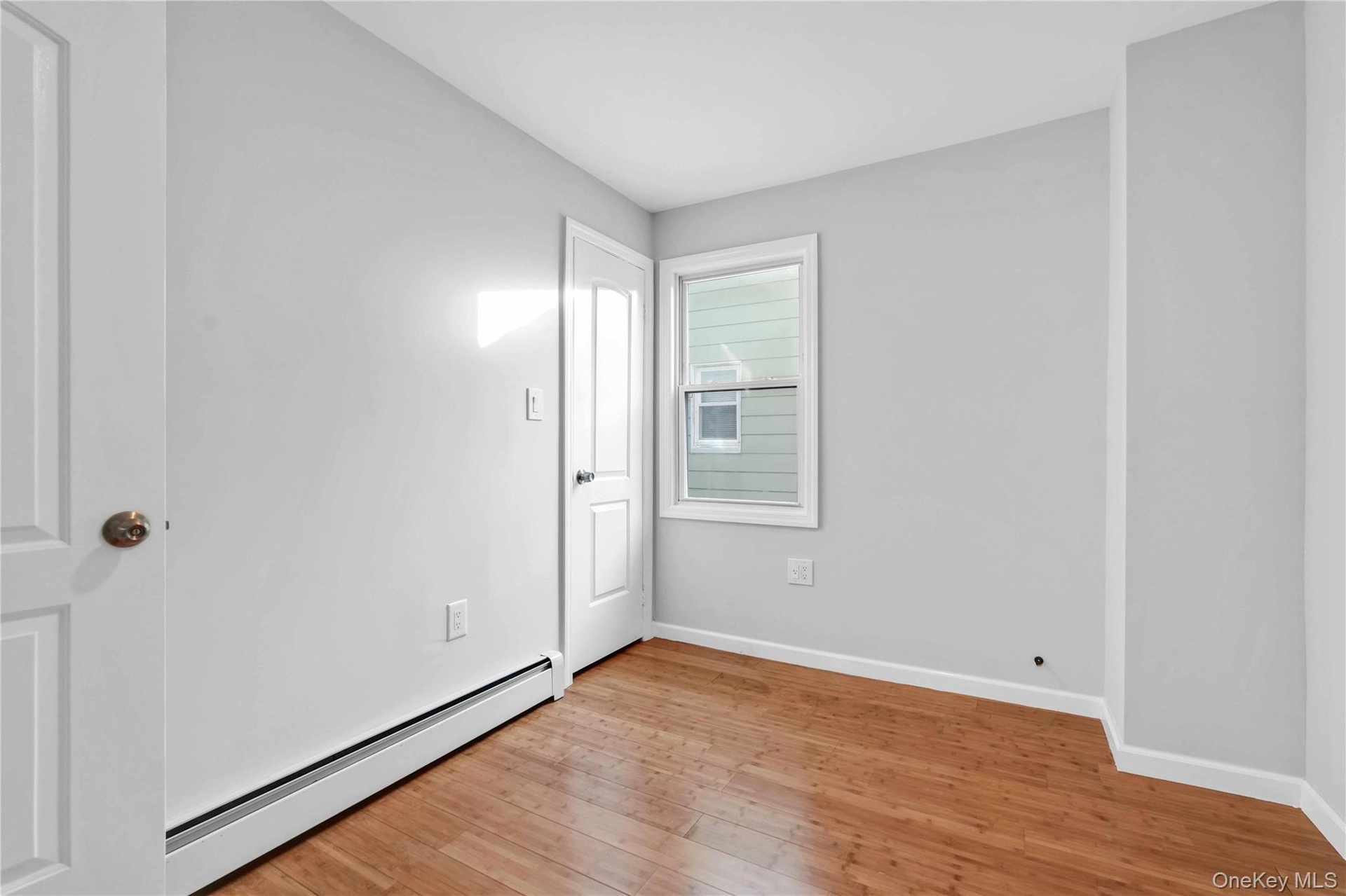 - Unfurnished room with baseboard heating and light wood-type flooring