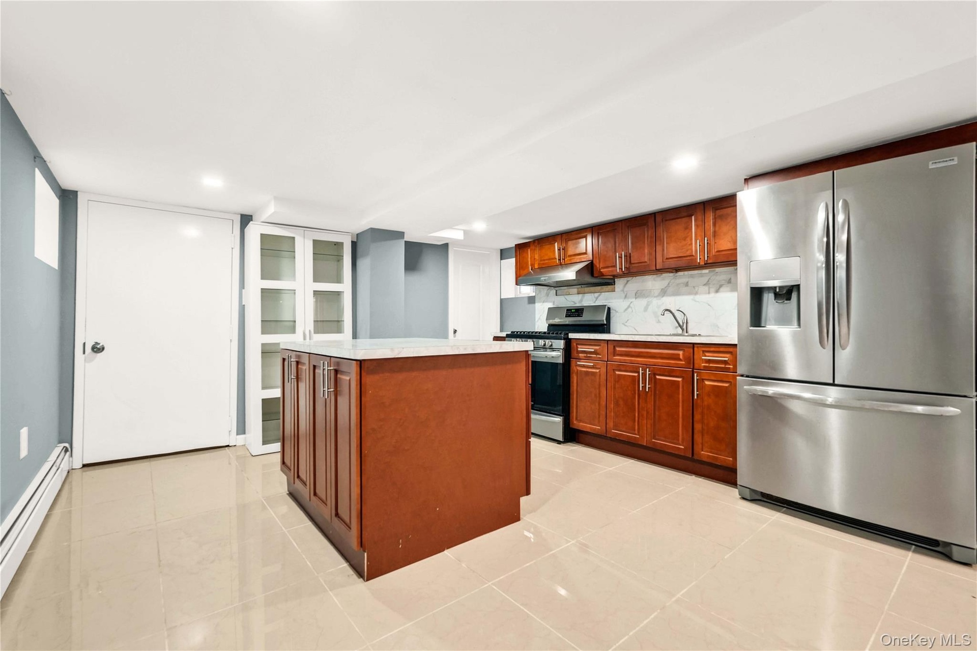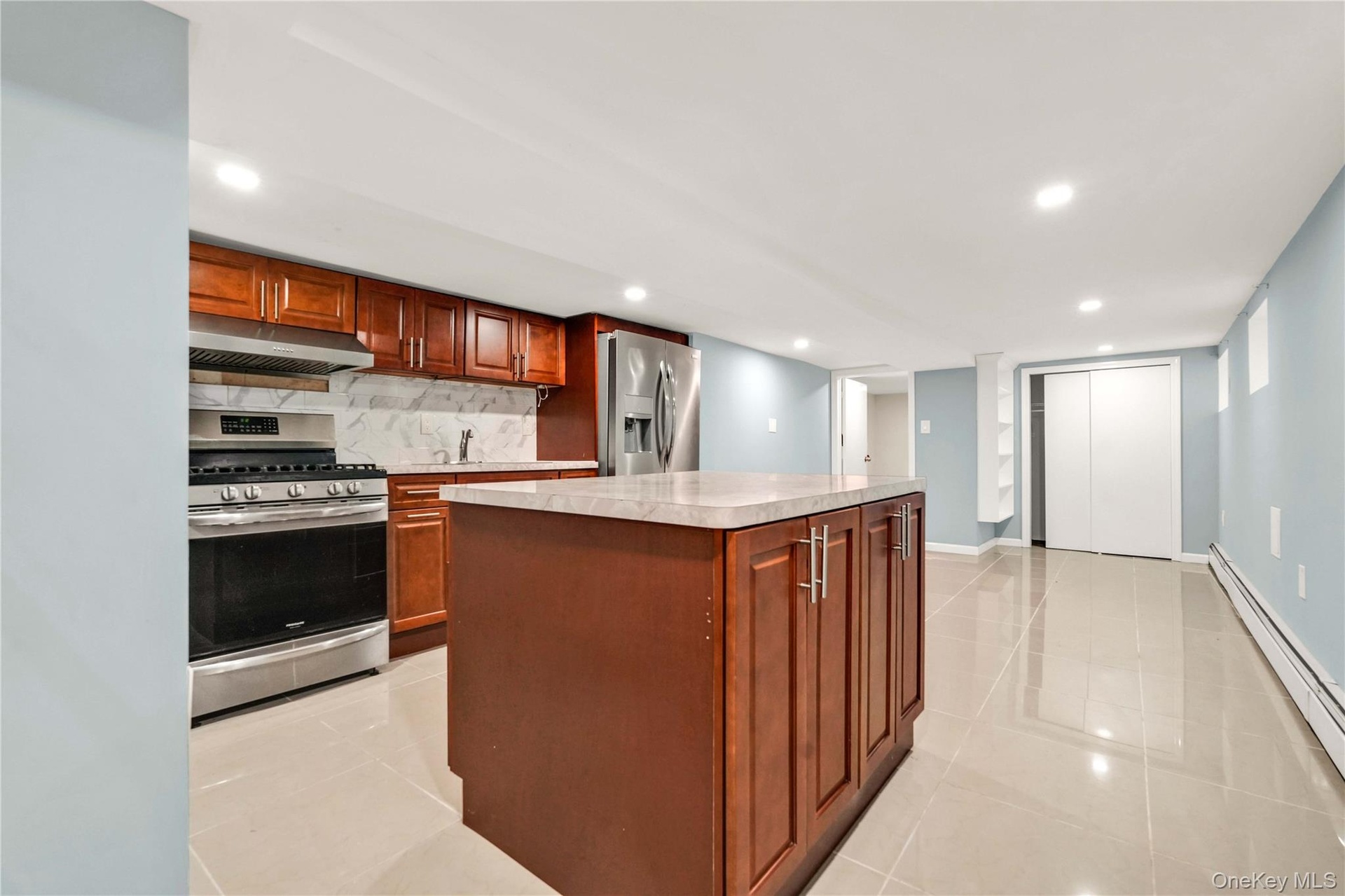 - Kitchen with stainless steel appliances, light tile patterned floors, a baseboard radiator, a center island, and backsplash