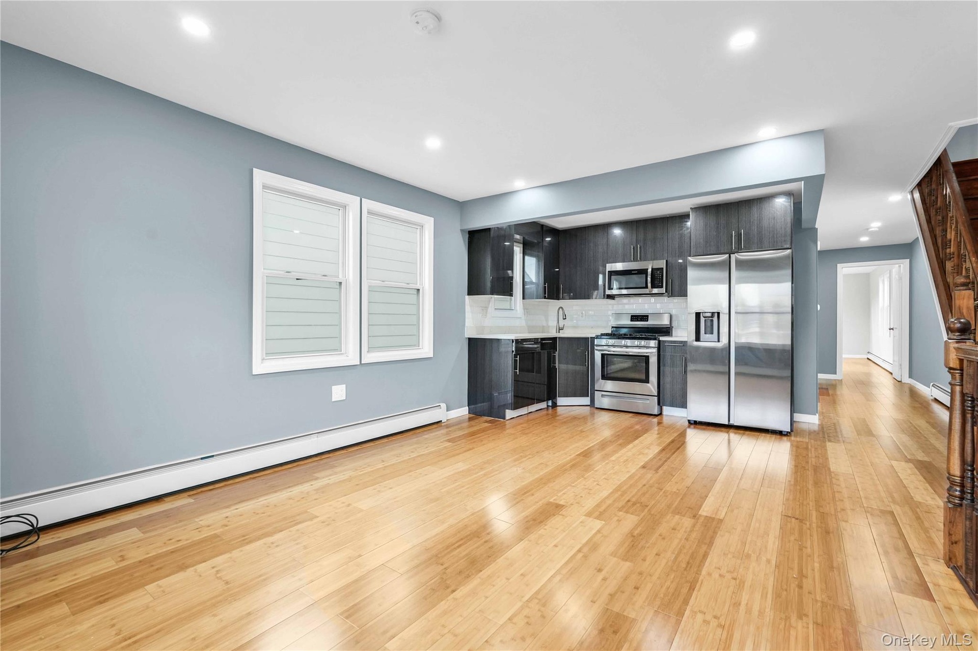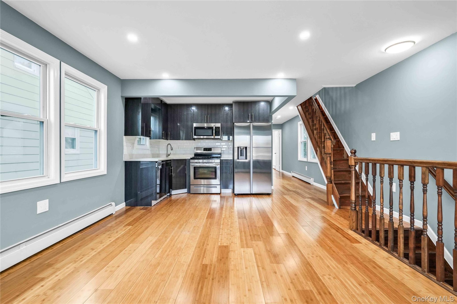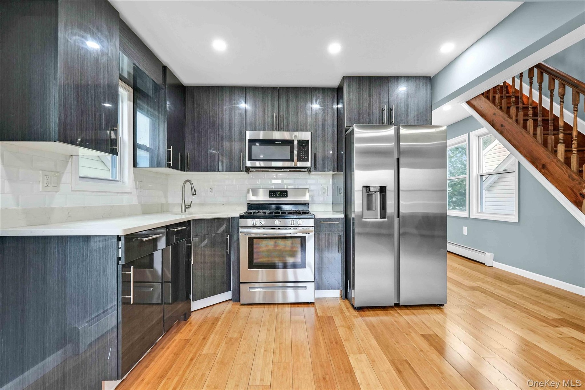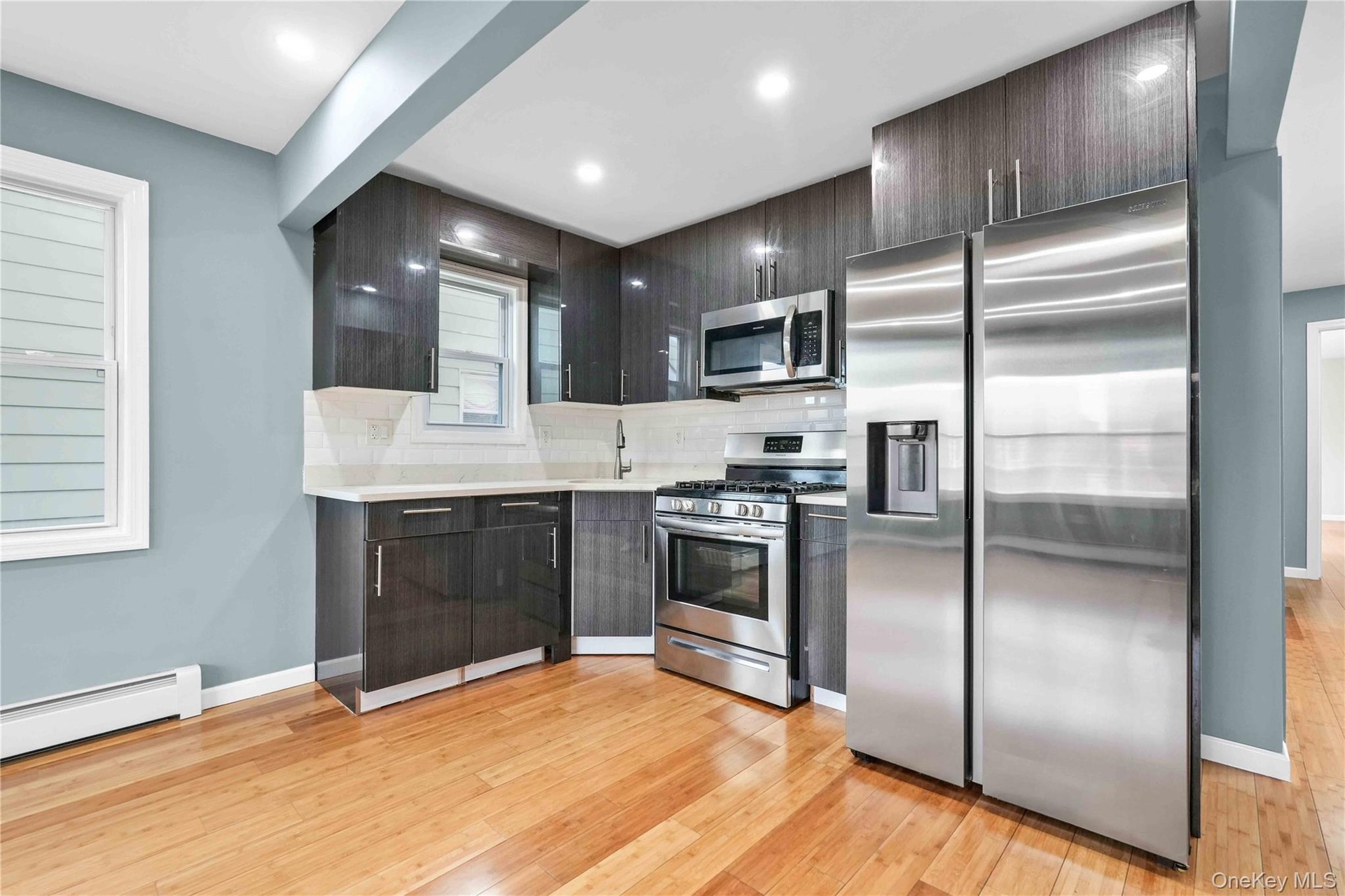 - Kitchen with stainless steel appliances, baseboard heating, backsplash, light wood-style floors, and modern cabinets