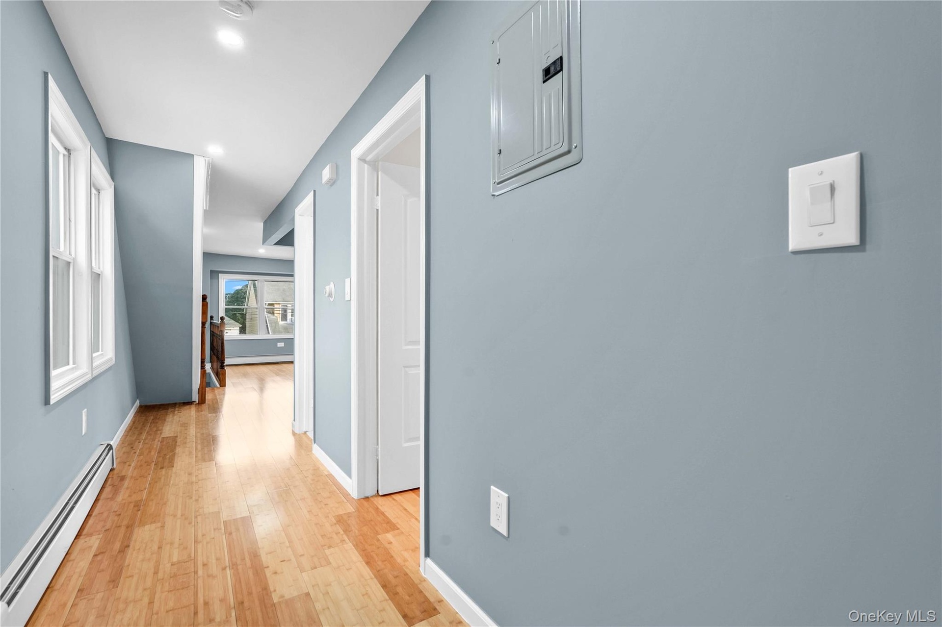 - Hall featuring a baseboard heating unit, electric panel, and light wood-type flooring