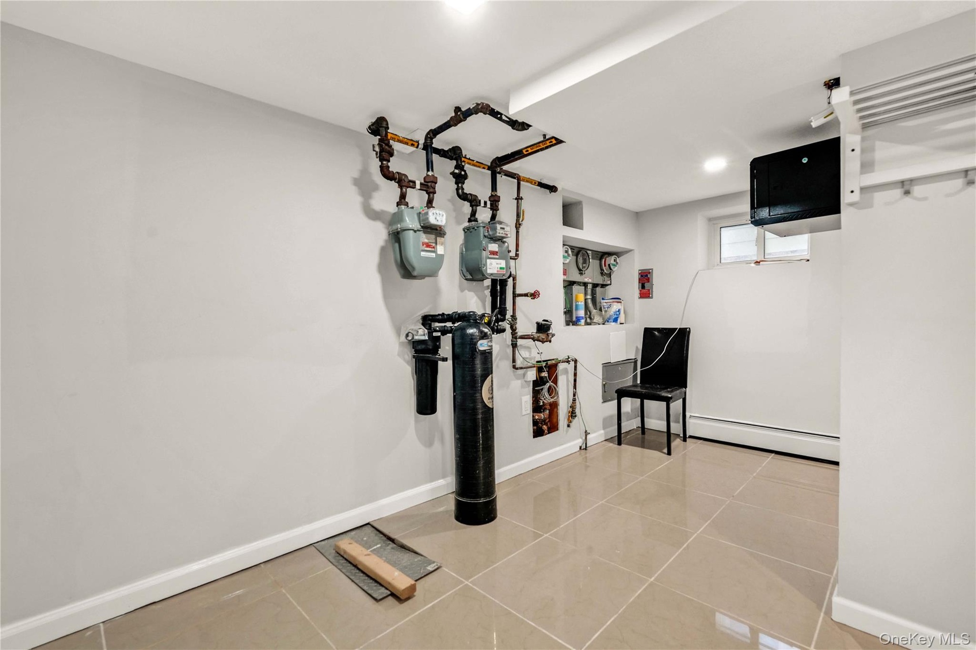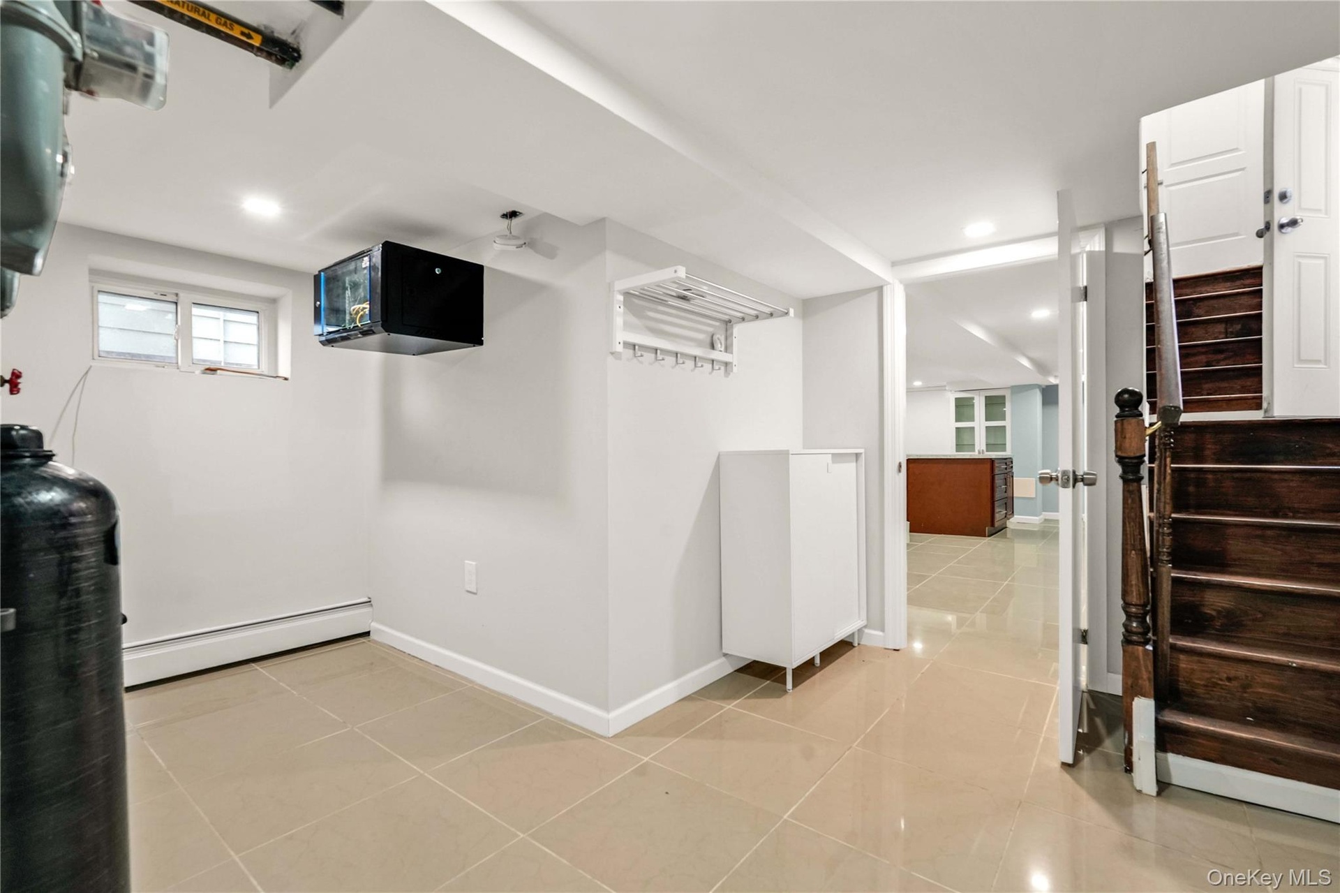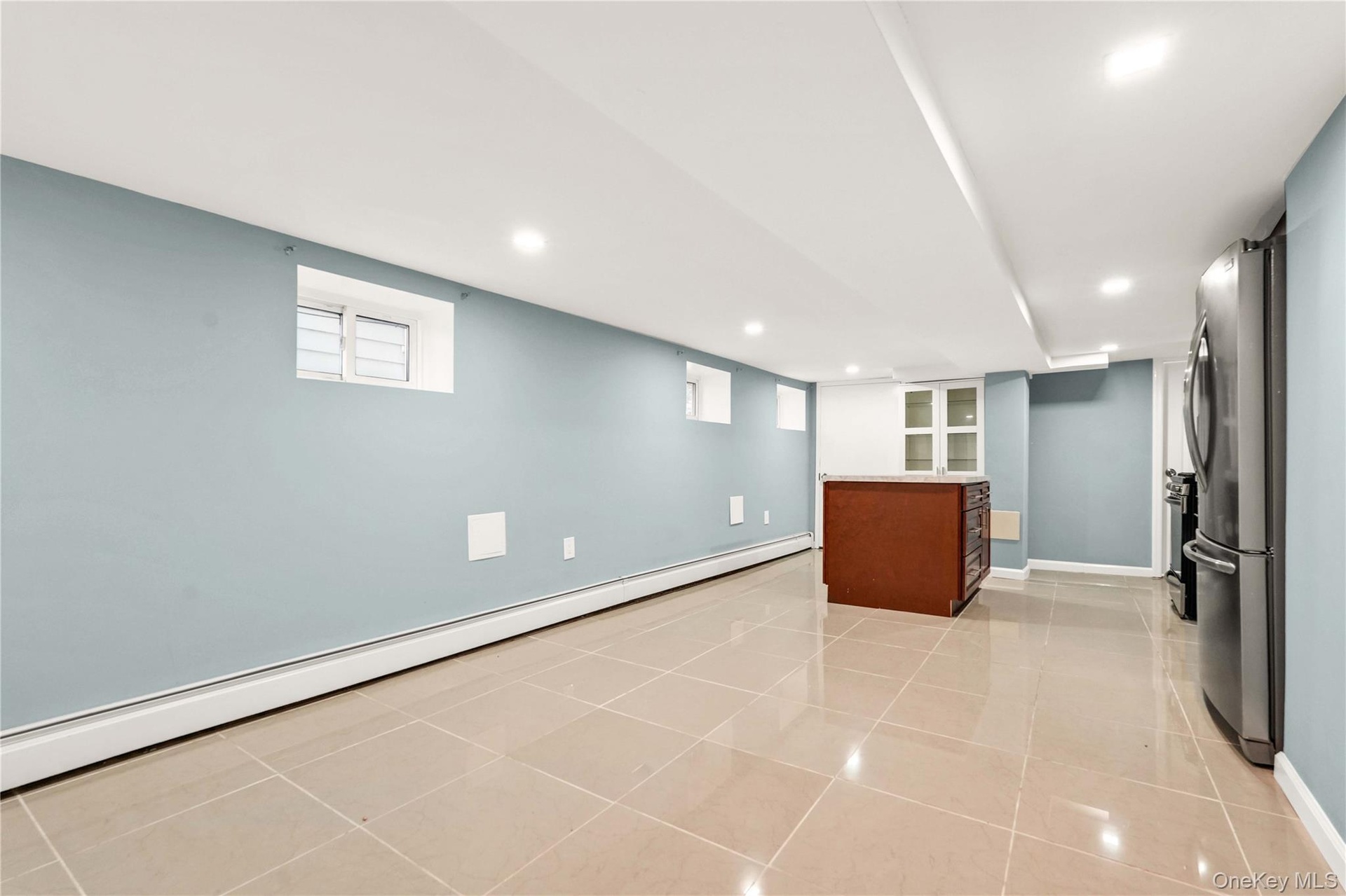 - Basement with baseboard heating, light tile patterned floors, freestanding refrigerator, and recessed lighting