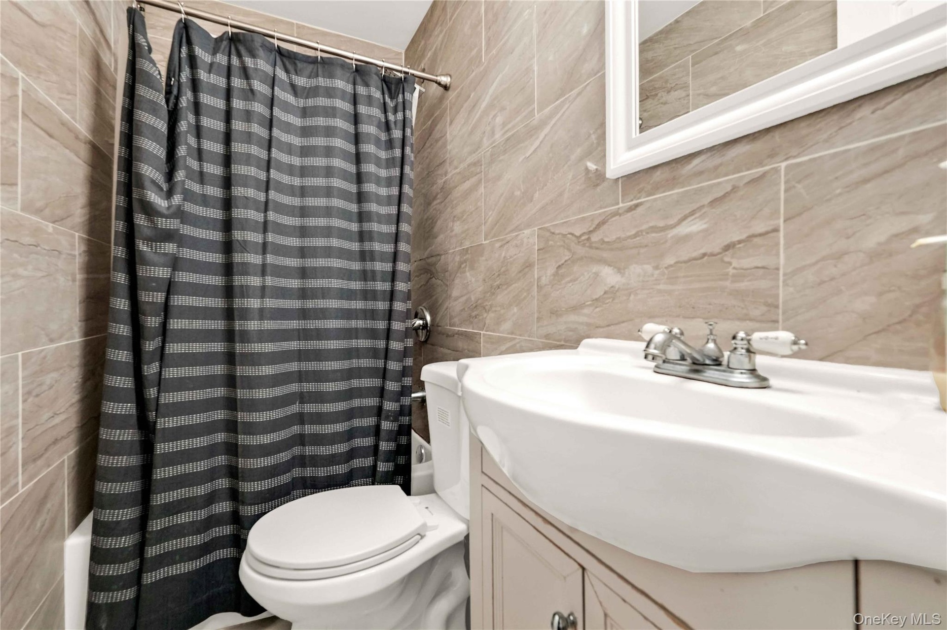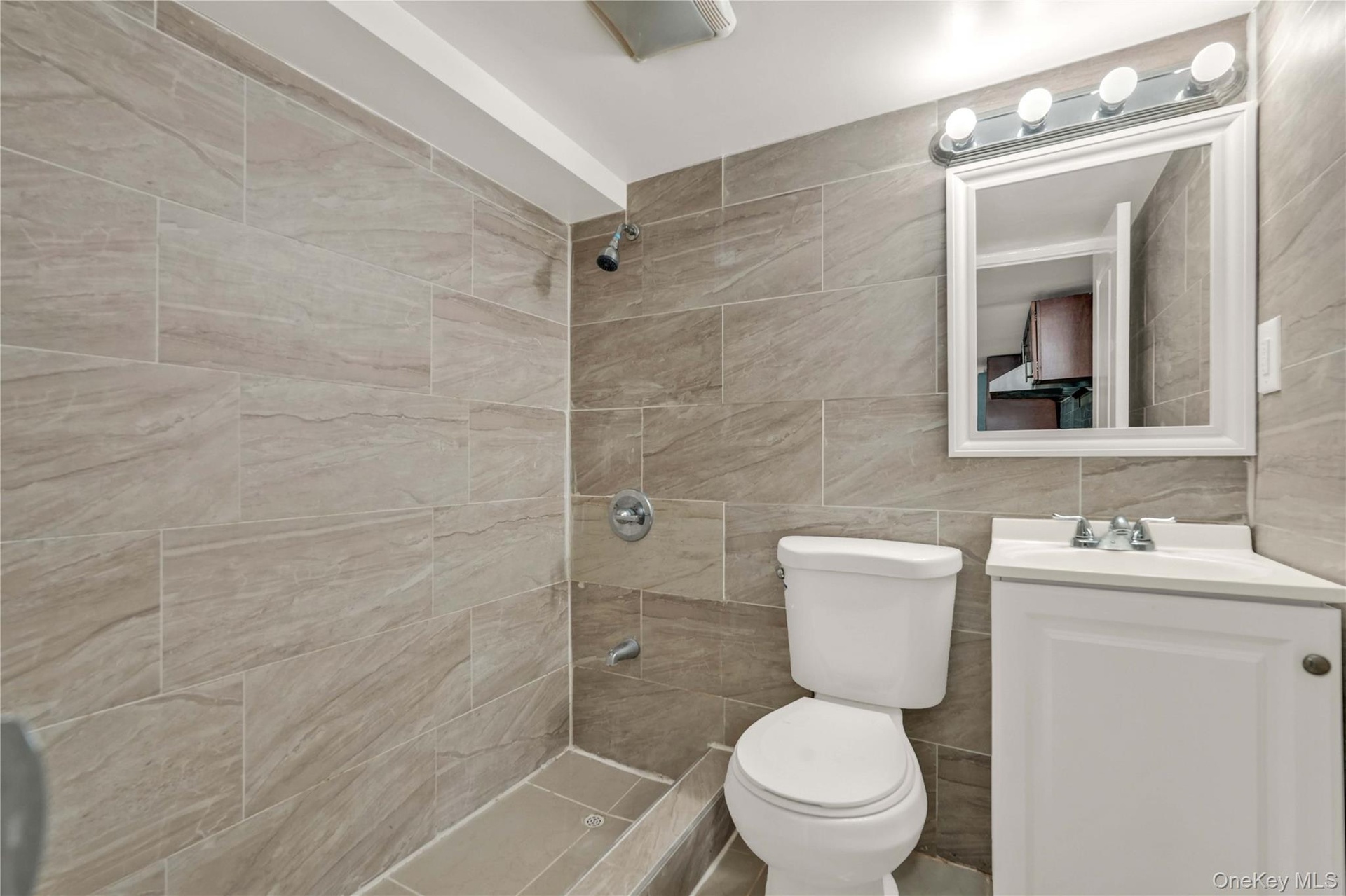 - Bathroom with tile walls, shower / bathtub combination, and vanity