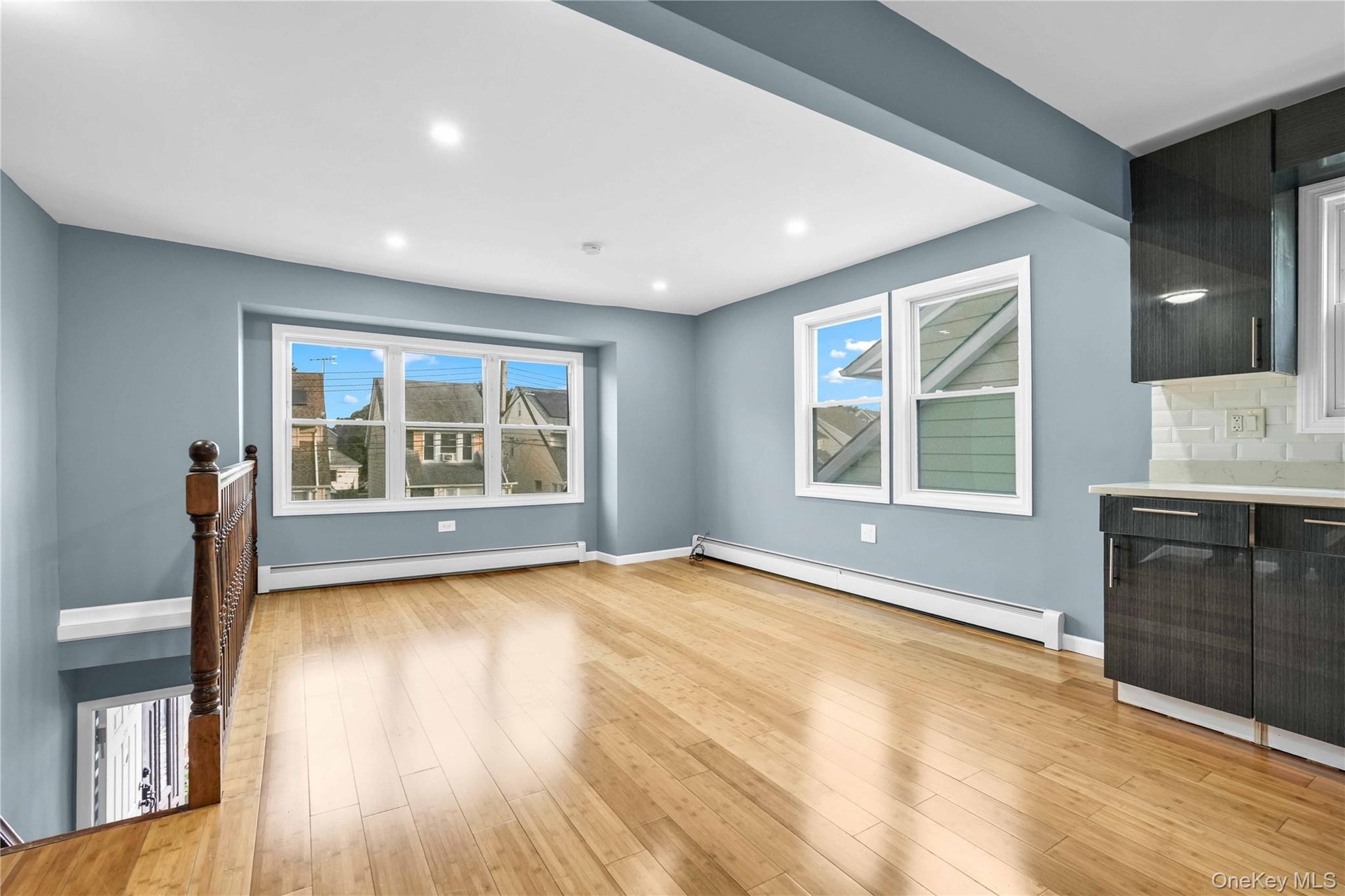 - Unfurnished living room featuring a baseboard heating unit, light wood-style flooring, and recessed lighting